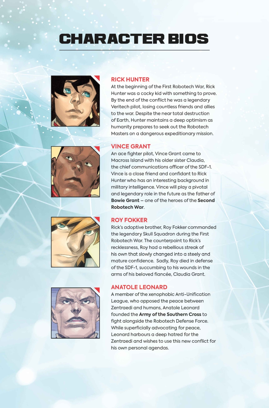After the devastating events of the Macross saga, RICK HUNTER must face an all new threat, along with the ghosts of his past – when a Zentraedi splinter group attacks Yokohama, Rick is called to investigate! Piloting the new prototype YF-4 Veritech, Rick encounters old friends and new enemies, all while recounting the moments of his life that shaped most epic moments in the ROBOTECH universe!