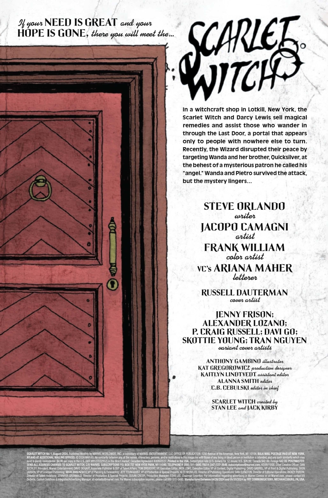 STEVE ORLANDO’S SCARLET WITCH RUN REIGNITES! The Scarlet Witch has carved out a haven for herself in upstate New York, but it’s all about to go up in flames. Wanda’s newfound peace has drawn the wrath of a primal force unlike anything she’s ever faced before, and it won’t stop until it razes Wanda’s world to the ground. It’s a clash of titans as Wanda and her allies fight for all she holds dear! What happens when an unstoppable force meets the end of all things? When pure chaos meets pure destruction? Wanda’s about to find out – if she survives long enough. Jacopo Camagni (X-MEN: RED, Nomen Omen) joins writer Steve Orlando for an explosive new chapter of Scarlet Witch’s story!