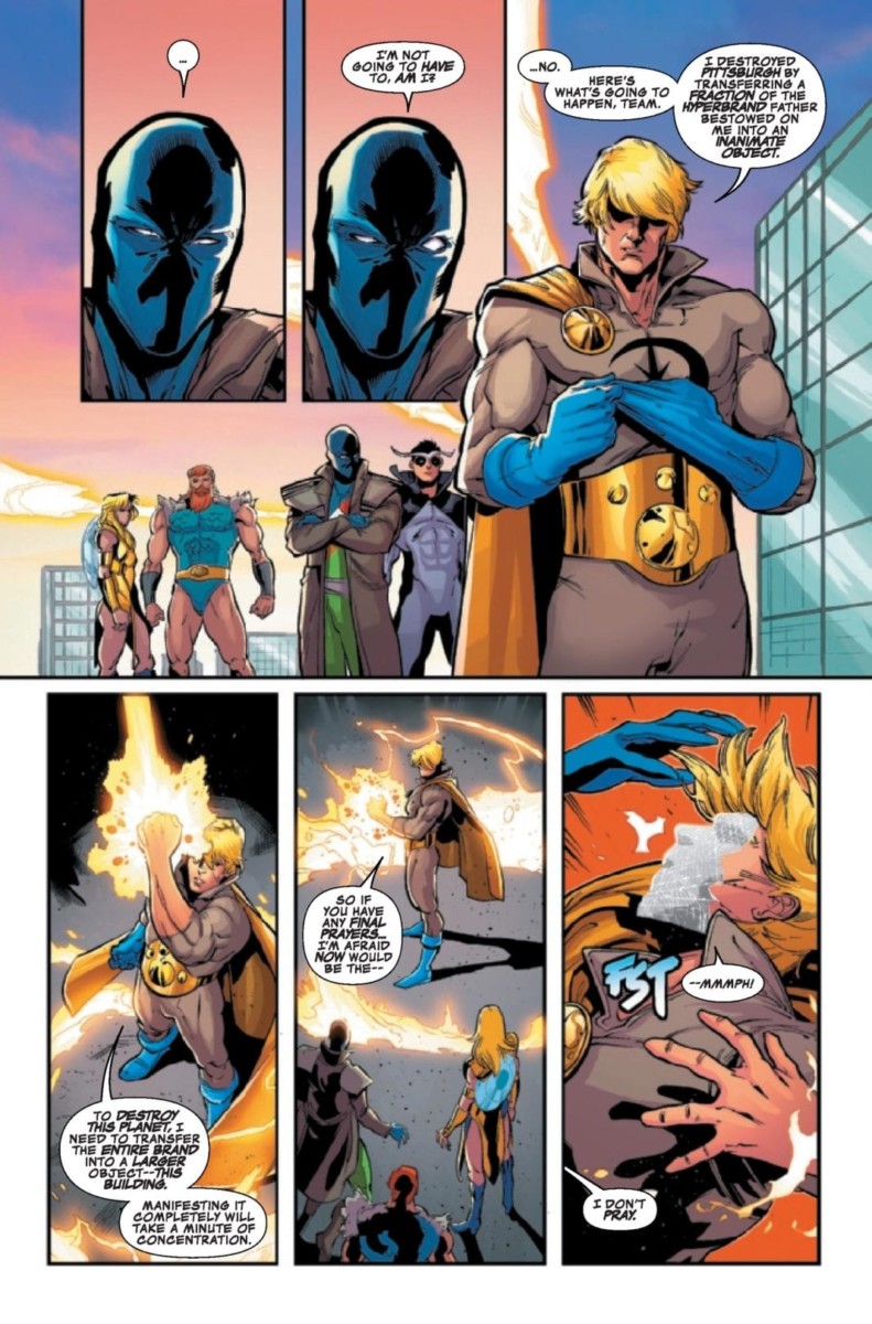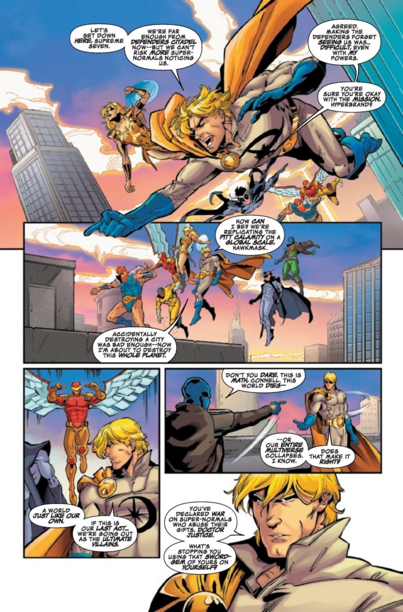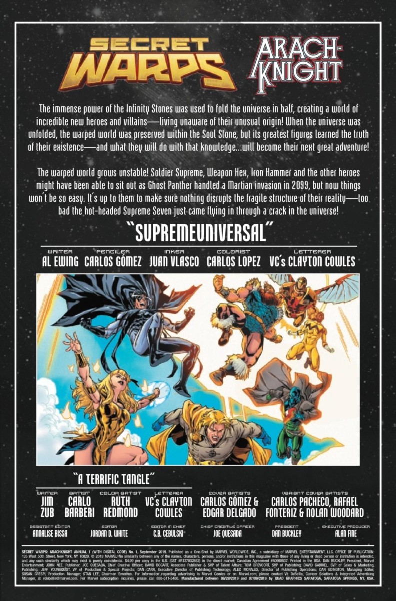 “SECRET WARPS,” PART 4 – SUPREMEUNIVERSAL! The web-spinning Arachknight finds himself out of the depth of all four of his personas as his own warped universe begins colliding with another – the New Supreme Universe, homes of the Supreme Seven! PLUS: A bonus tale of ol’ AK trying to persuade the Terrific Two to become a Trio!