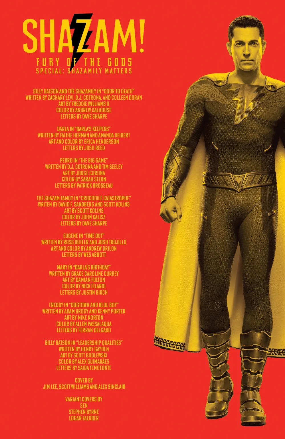 This 96-page giant features stories starring all of your favorite Shazam! characters as written by the actors who play them! Actor Zachary Levi takes the reins on writing Shazam, and Adam Brody, Ross Butler, D.J. Cotrona, Grace Caroline Currey, and Faithe Herman wield the mighty pen for their Shazamily superheroes! Battle zombies, befriend dinosaurs, try to get a phone signal in a world of barbarians, explore glitter land, and more just in time for the release of the brand-new feature film Shazam! Fury of the Gods! Made with all the love and fun of a superhuman family cookout!