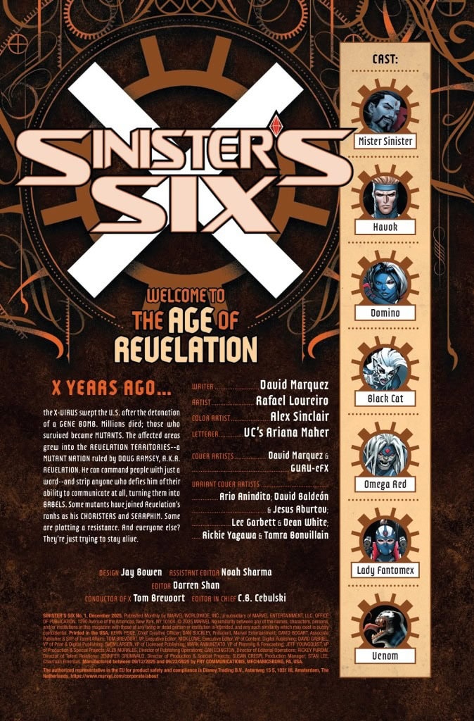 A SINISTER HEIST! X YEARS LATER, Mr. Sinister assembles an elite strike force to take his rightful place…on the throne of Revelation! What has Sinister offered Havok, Black Cat, Domino, Omega Red, Fantomex and Venom to convince them to take on impossible odds? Are Sinister’s misfits throwing their lives away, or has Revelation underestimated how far his subjects will go when there’s nothing left to lose?