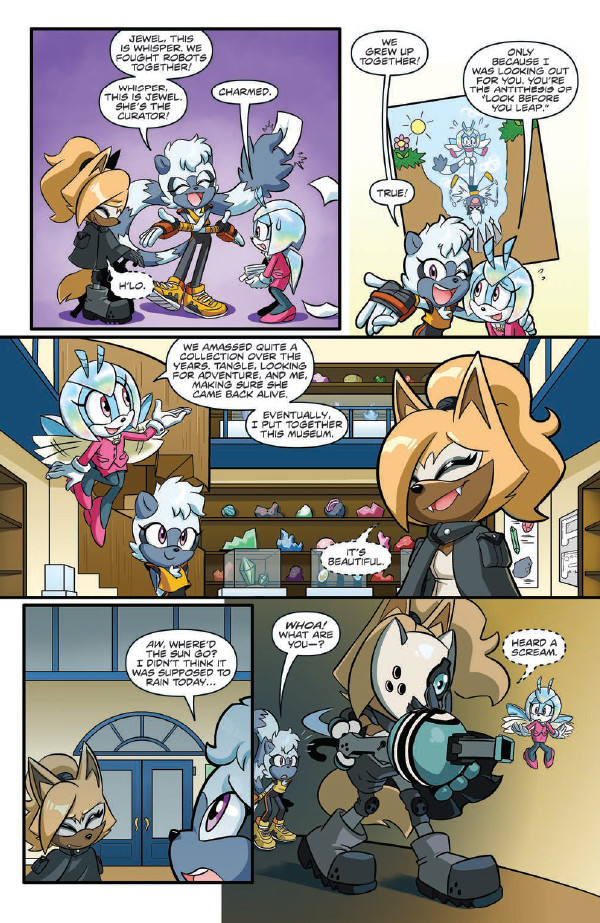 In the lead story, the odd couple of Tangle the Lemur and Whisper the Wolf team-up to save a friend in need! Then Sonic and Tails take the Tornado for a spin, but is Sonic going too fast? Plus, Silver and Blaze slow down for a minute to go gardening, the Sonic Fan Club has their first official meeting, and Rouge the Bat hunts for treasure!