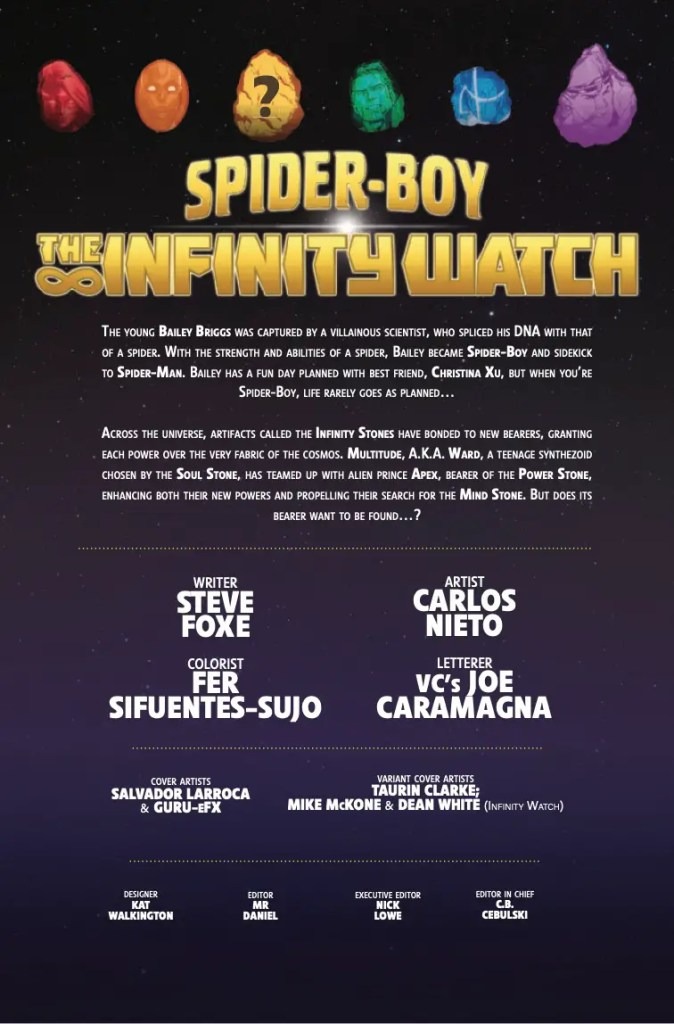 “INFINITY WATCH” PART EIGHT! Spider-Boy is juggling being Spider-Man’s sidekick, keeping his friends safe and just being a regular kid. But nothing stops him from jumping in when trouble is brewing! This time he’s joined by Multitude, who has the Soul Stone, and Prince of Power, who has the Power Stone (of course!), as they face off against a mysterious evil they vow to stop!