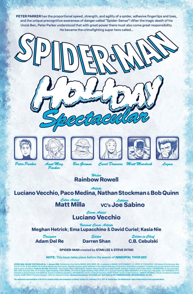 HOLIDAY PLANS NO MORE! Peter Parker is all alone for the holidays… Luckily, the Spectacular Spider-Man has some amazing friends he can celebrate with! But can the Fantastic Four, the Avengers, the X-Men, Daredevil and more handle winter with the wisecrackin’ Web-Head? Or will the Thing have to send Spidey packing to ensure a silent night? Rainbow Rowell and a bevy of Marvel’s finest artists deliver a holiday romp to all the good boys and girls who read magnificent Marvel mags!