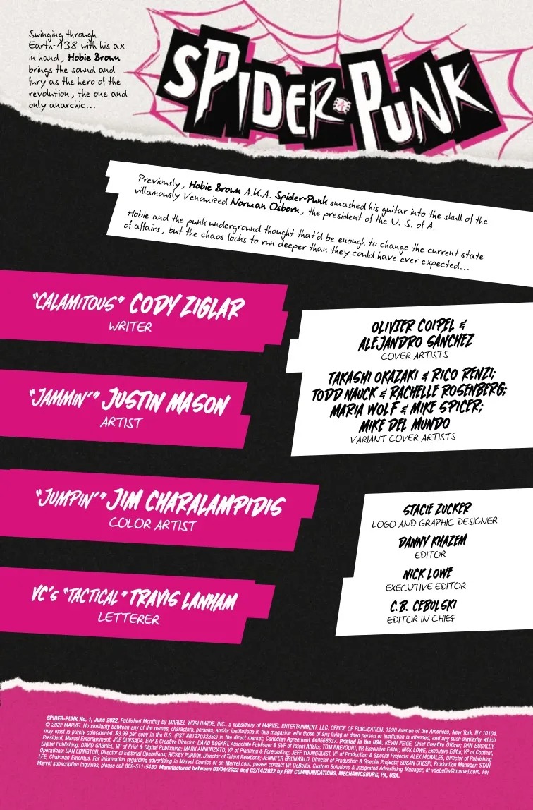 ANARCHY IN THE SPIDER-VERSE! SPIDER-PUNK GETS HIS OWN SERIES! HOBIE BROWN is THE ANARCHIC SPIDER-PUNK — set to protect EARTH-138 with his ax in hand and his chaotic band of punk rockin’ heroes backing him! NORMAN OSBORN is dead, but will the chaos he’s created be too much for Spider-Punk and gang to handle? Feel the vibes as CODY ZIGLAR (AMAZING SPIDER-MAN) and JUSTIN MASON bring you the jams when “BANNED IN DC” begins here!