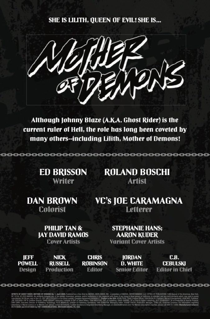 BURNING OUT OF THE PAGES OF GHOST RIDER! Since the dawn of man, she has birthed the worst of humanity’s ills… Her kin call her mama while men curse her name: LILITH! And when all the thrones of every netherworld are united, they shall call her by a new name: QUEEN. With art by definitive GHOST RIDER artist ROLAND BOSCHI!