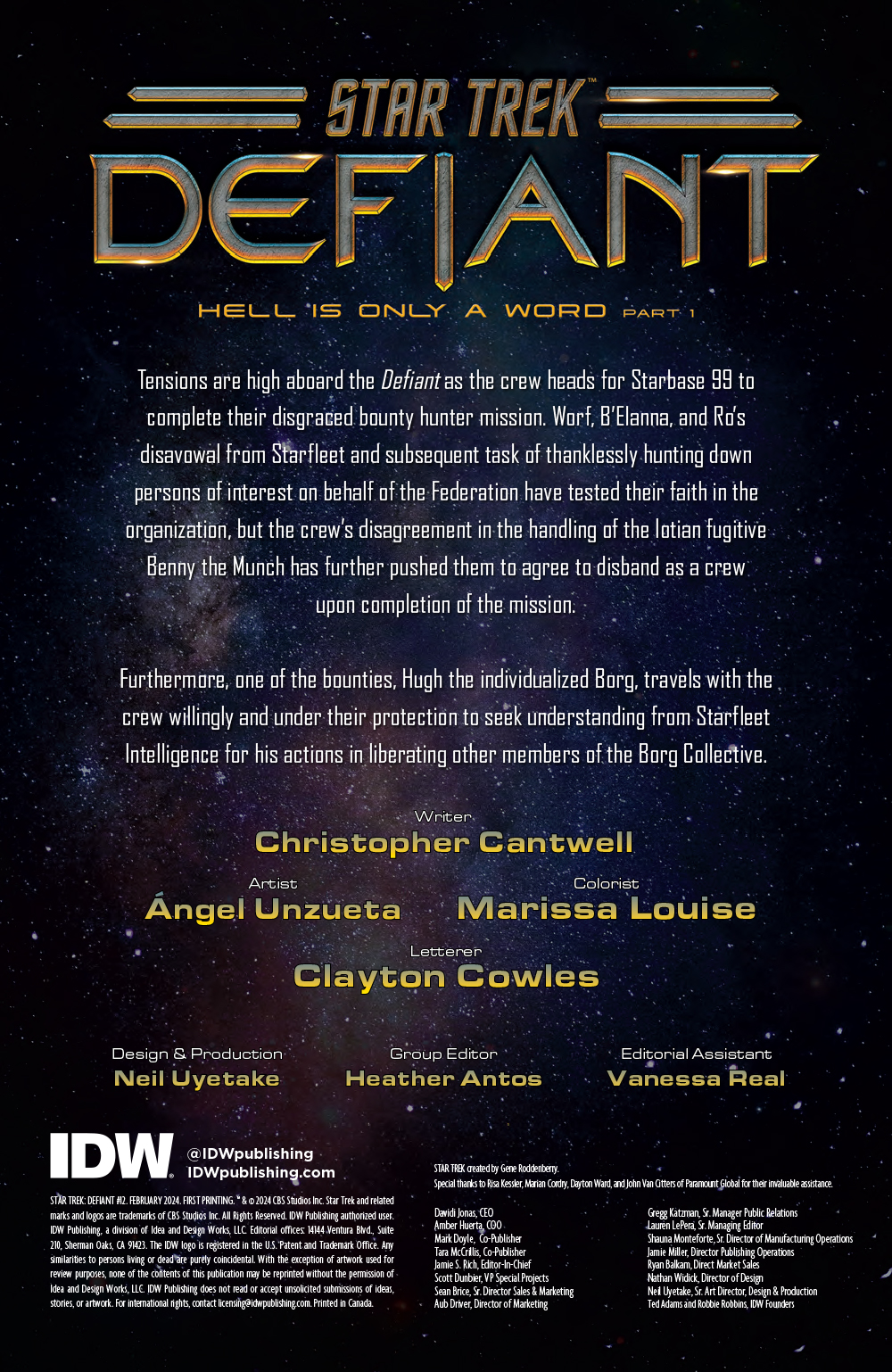 Original Star Trek: Defiant writer-artist duo Christopher Cantwell and Ángel Unzueta delve into the sci-fi horror genre in arc three of the fan-favorite series! Eager to move past the unofficial bounty-hunting mission assigned to them by Starfleet, disgraced former ambassador and Starfleet legend, Worf, and his rogue crew make way for Starbase 99, a run-down remnant of the Dominion War, to complete their fugitive drop-off. The clandestine assignment has left them disillusioned with Starfleet and with one another, but a surprise awaits the Defiant crew, threatening to tear the crew apart even further-literally.