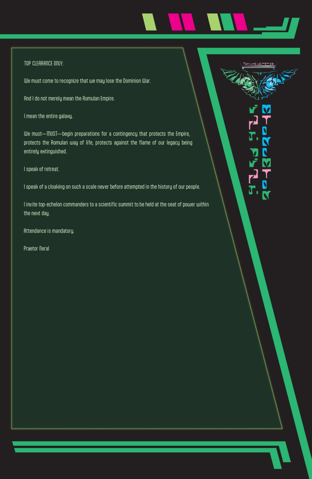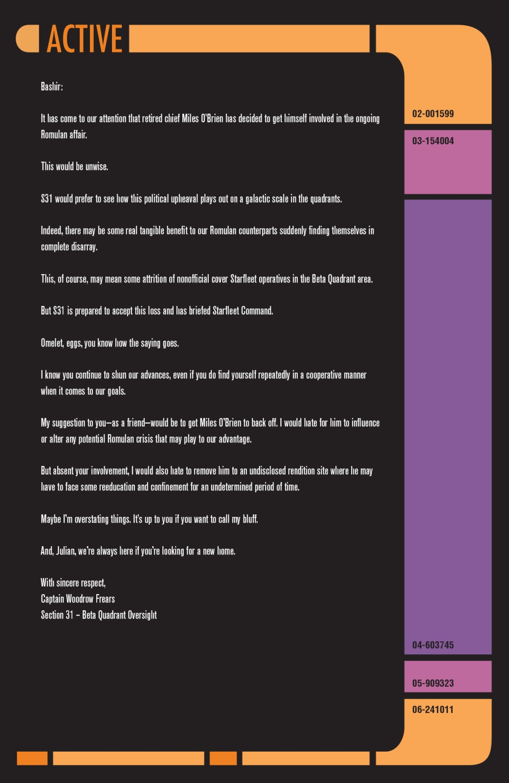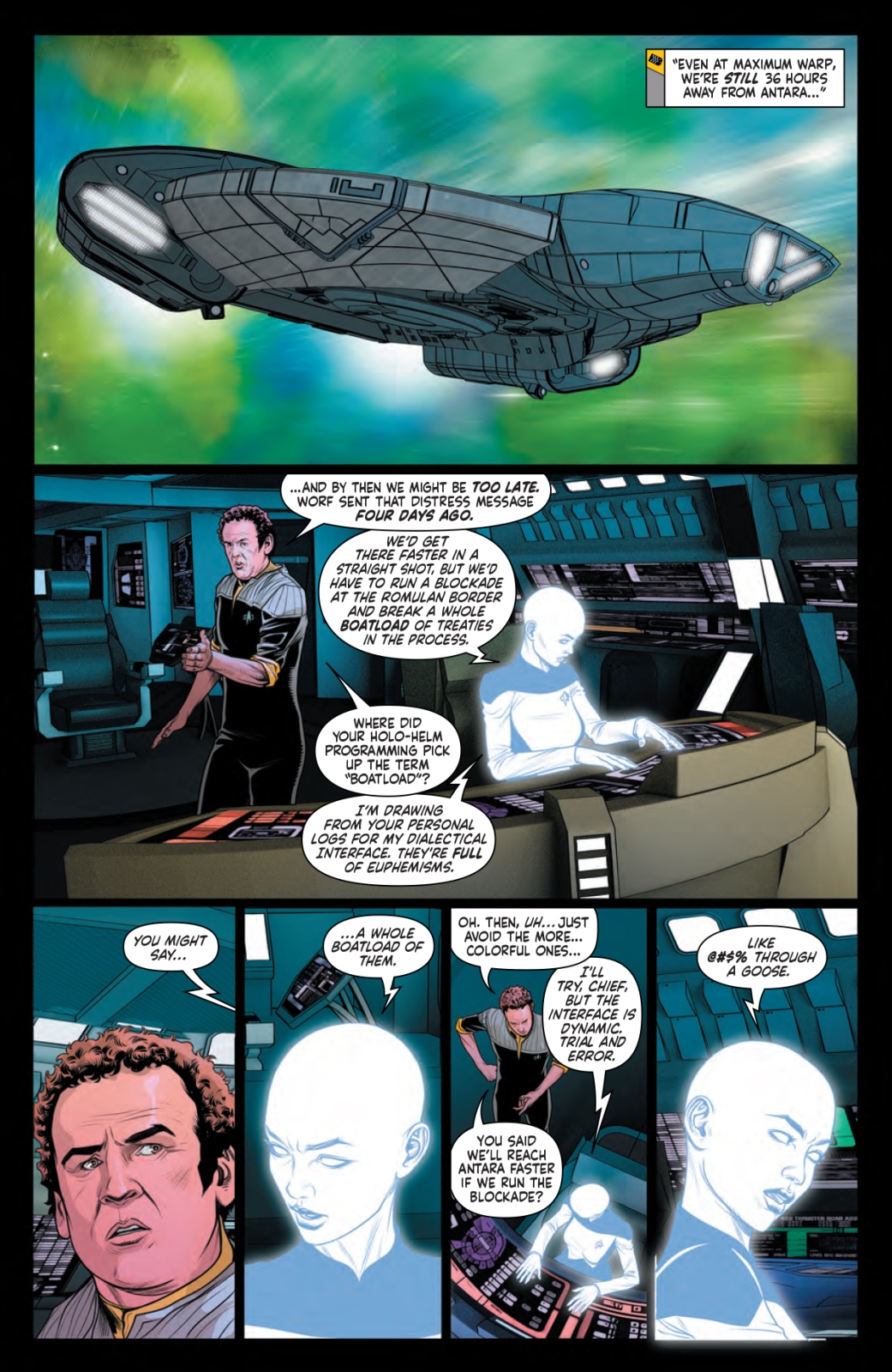 Miles O’Brien and his trusty holo-helm set course for the planet Antara as Romulan forces prepare to besiege the population with Worf, B’Elanna, and Ro among them. A menacing Romulan blockade stands between him and his friends, but as he braces to brave the Romulans alone, matters are further complicated when an old friend-none other than Dr. Julian Bashir-delivers an urgent message from Section 31. Meanwhile, on Romulus, Commander Sela and Spock uncover a dark secret that General Revo is willing to kill to keep secret!