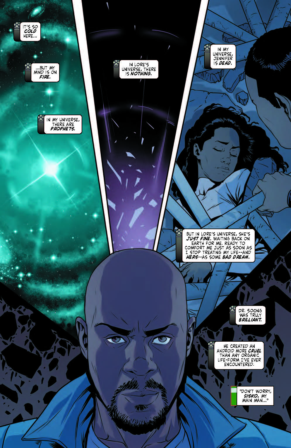“Lore War,” Part Four. Sisko is approaching a moment of crisis: Lore is god of the universe, and the number of heroes operating outside his influence is dwindling with every encounter. Everywhere Sisko looks, he sees those he’s failed. Is he really the person meant to defeat Lore and restore his timeline? Just as he is about to set down the burden of leadership… he dreams of a familiar blue light… and remembers there is hope yet in the universe waiting for those with the courage to seek it out!