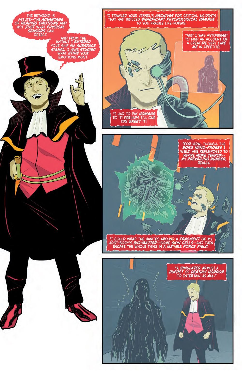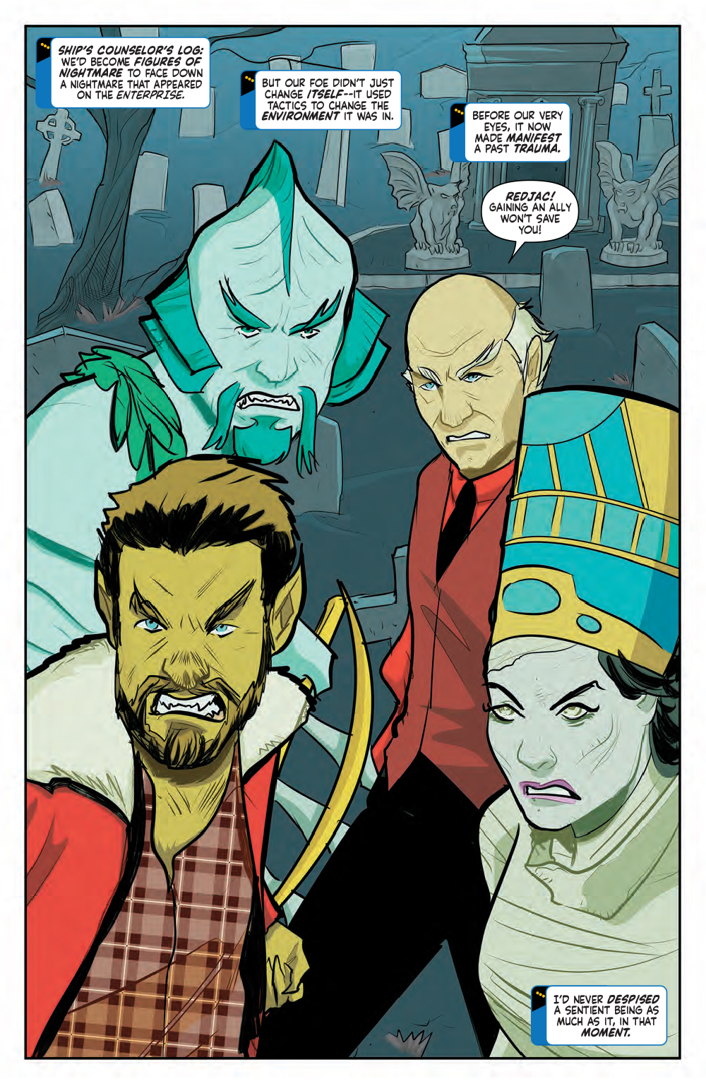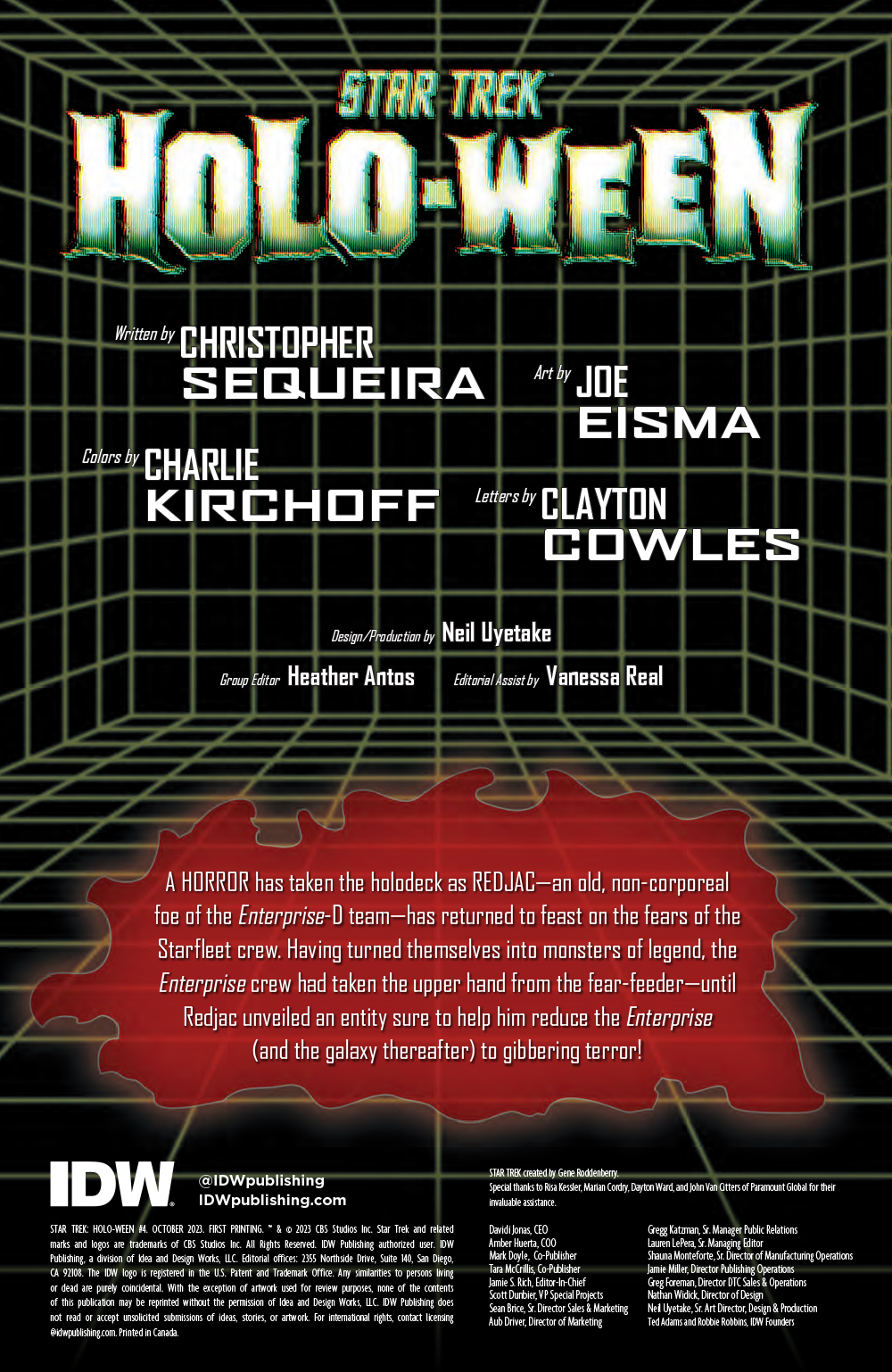In this final issue of horror on the holodeck, Redjac pulls in a creature to join him in terrorizing the crew. Step one, feast on the fears of the U.S.S. Enterprise-D crew. Step two, reduce entire worlds to gibbering terror! Can our heroes overtake these evil entities before they lose themselves to the monsters within?