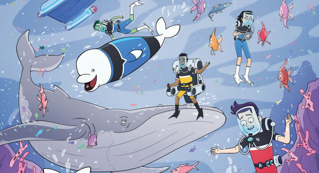 [Translation: But the remaining humpbacks have all heard freaky conspiracy theories about what happened to the last pod who went to Earth. To save the species, the Lower Deckers will have to dissuade them of the rumors and convince them Earth is worth inhabiting. Ah-yikes.]