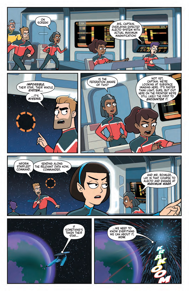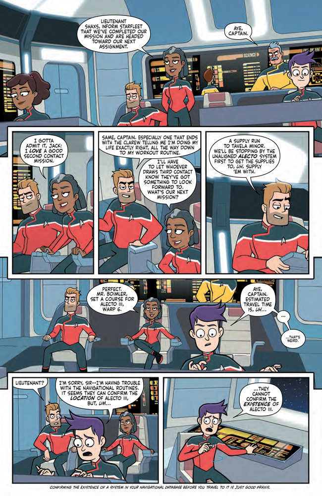 The crew of the USS Cerritos have just received their personality guidance reports from the counselors of the planet Clarew, and Rutherford feels guilty he’s not engineering at a higher capacity with his implants. He should be operating above 134 percent nominal at least. The Cerritos’ next mission is a supply run to Tavela Minor, but they first need to stop by the Alecto system to get some supplies to, uh, supply them with. However, just before they warp, they see the Alecto system isn’t only missing; it doesn’t exist. Like at all. Now they have a space mystery at hand: What could cause a whole star system to disappear?