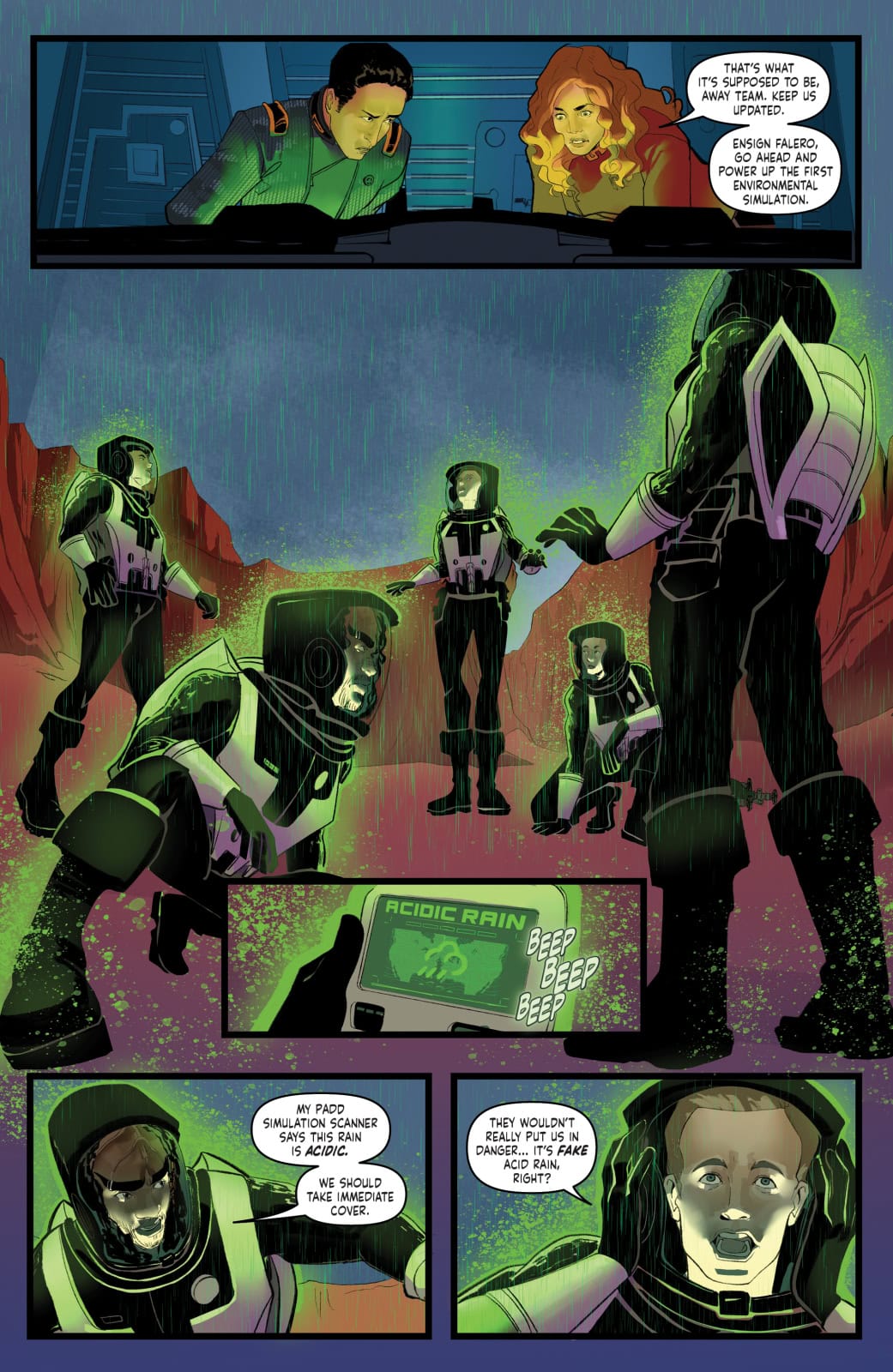 Caleb, Genesis, Jay-Den, Kyle, and Tarima are all students of Starfleet Academy, the illustrious school responsible for the Federation’s best. One day, they dream to serve as great leaders on board ships of their own, to study the cultural intricacies of sentient life amongst the Galaxy, or to go where no person has explored before. But today, their mission is simply to execute a survey simulation on a lifeless, low-oxygen planet. Or at least, it seems simple… until a huge storm cuts off their contact with their teachers aboard the Athena… and something impossible appears: an alien. Now, they’ll have to work together and use everything they’ve learned in class about first contact to make it off the planet alive!