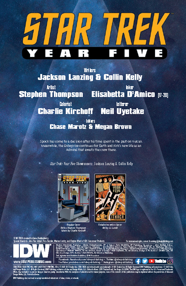 For five years, the U.S.S. Enterprise and her crew have journeyed to the edge of the known universe, tackling impossible challenges and menacing foes along the way. But the biggest challenge of all awaits them here at home… and no matter what happens, the lives of Captain Kirk and his crew will be changed forever. The grand finale of Star Trek: Year Five begins here with a new issue from showrunners Jackson Lanzing & Collin Kelly (Gotham City Garage, Green Arrow) and artist Stephen Thompson (Satellite Falling, Die Hard: Year One).