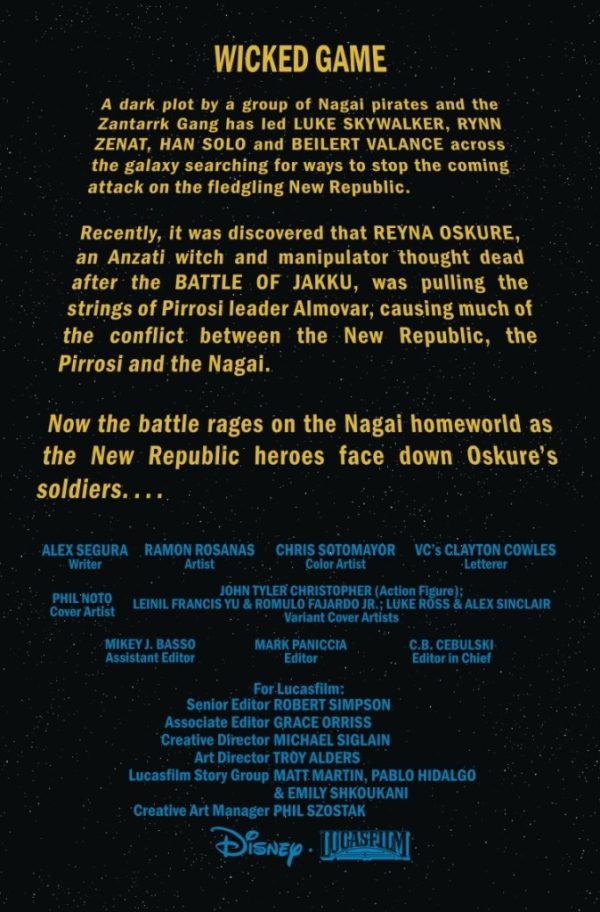 THE END FOR THE NEW REPUBLIC?! LUKE, LEIA, HAN and VALANCE struggle to reunite and help their Nagai allies fight for freedom! A shocking death as a hero falls at the hands of the ZANTARRK STORMTROOPERS! A villain’s desperate, final gamble puts everything the NEW REPUBLIC stands for in peril! Can an ancient JEDI RELIC rescue our heroes from certain death — or doom them?