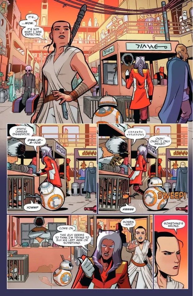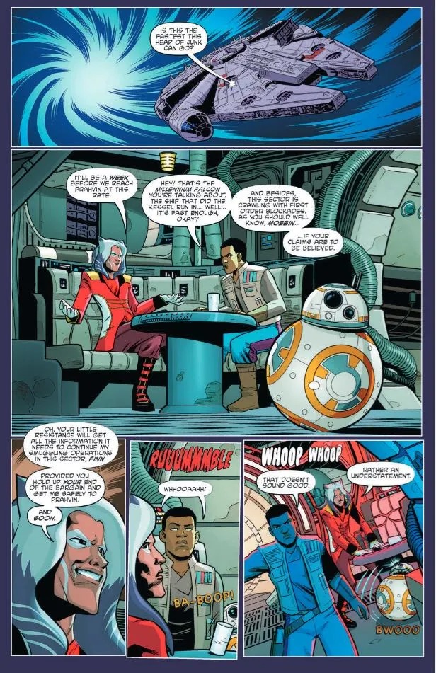 First, from author George Mann (Doctor Who), the Millennium Falcon needs some serious repairs after sitting in disrepair on Jakku. So Rey, Chewie, Finn, and BB-8 have to make a pit stop. But it doesn’t quite go as planned (it never does), and the group quickly finds themselves at the wrong end of a bounty hunter’s blaster.