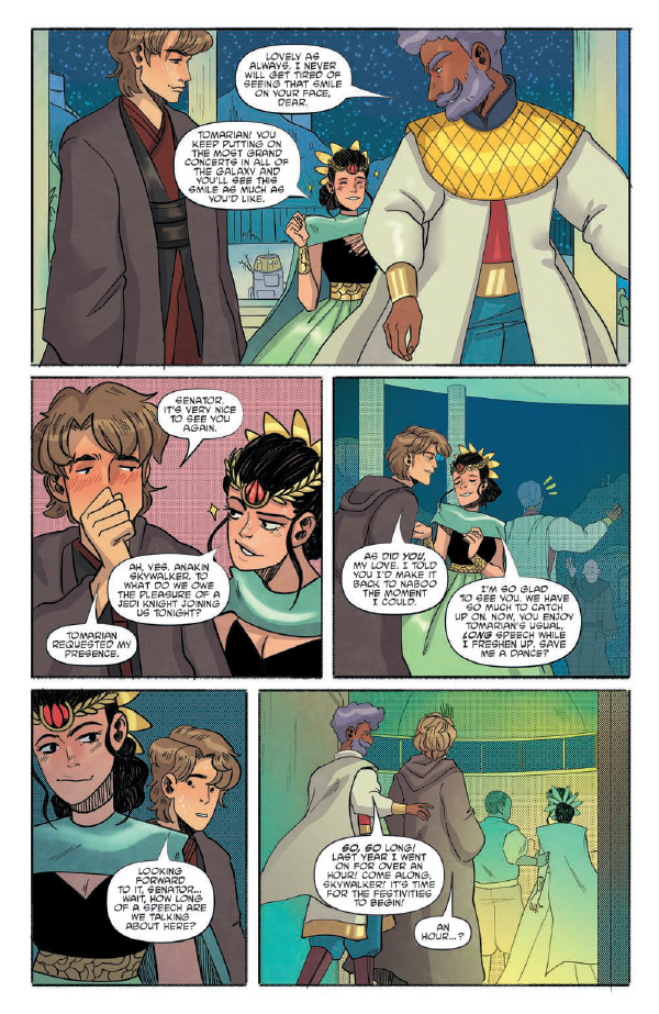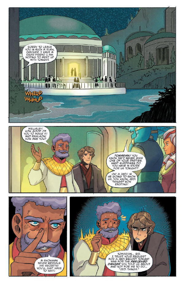Padmé and Anakin have grand plans to have a romantic night together after a long separation. But before they get a chance to get together, Anakin is Jedi-napped by a group of outlaws! Then, in a new Tale of Villainy, Grand Moff Tarkin proves just why he is one of the most dangerous and terrifying members of the Empire.