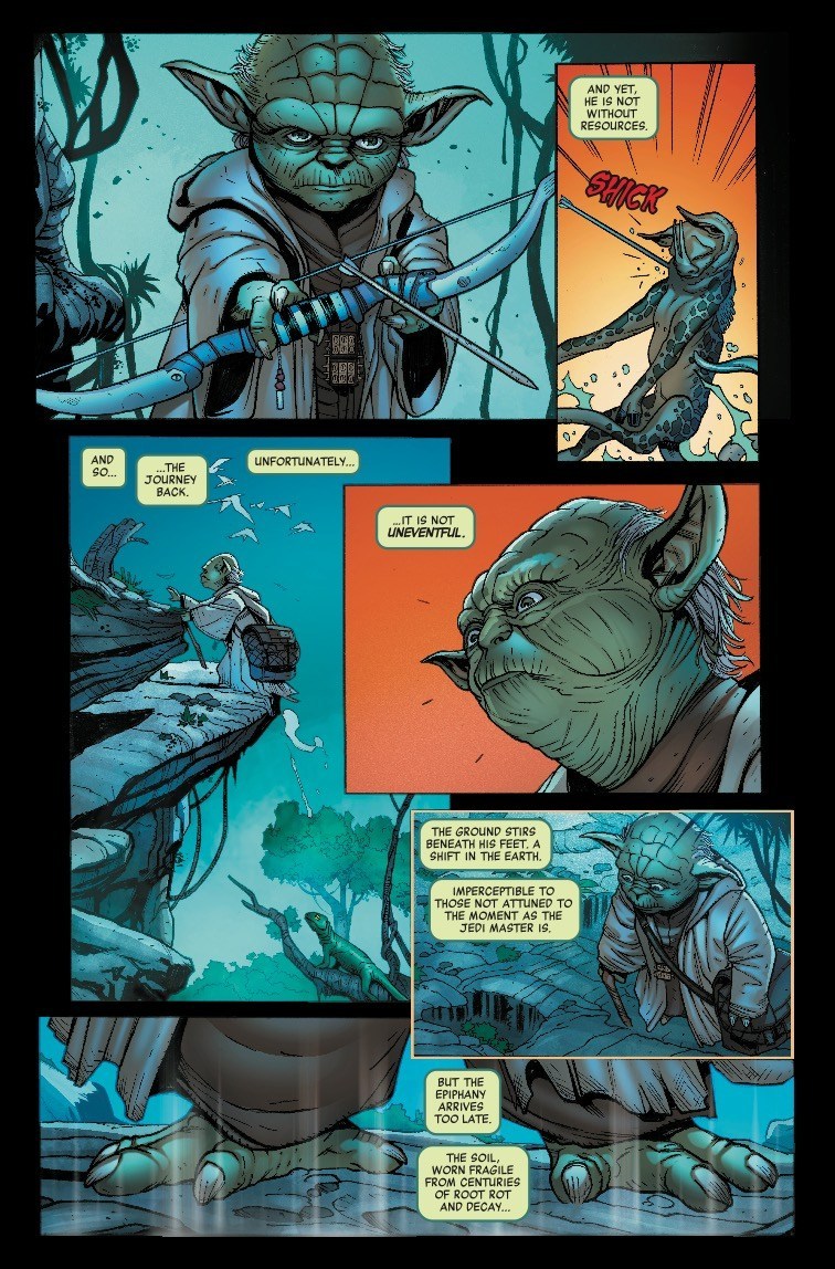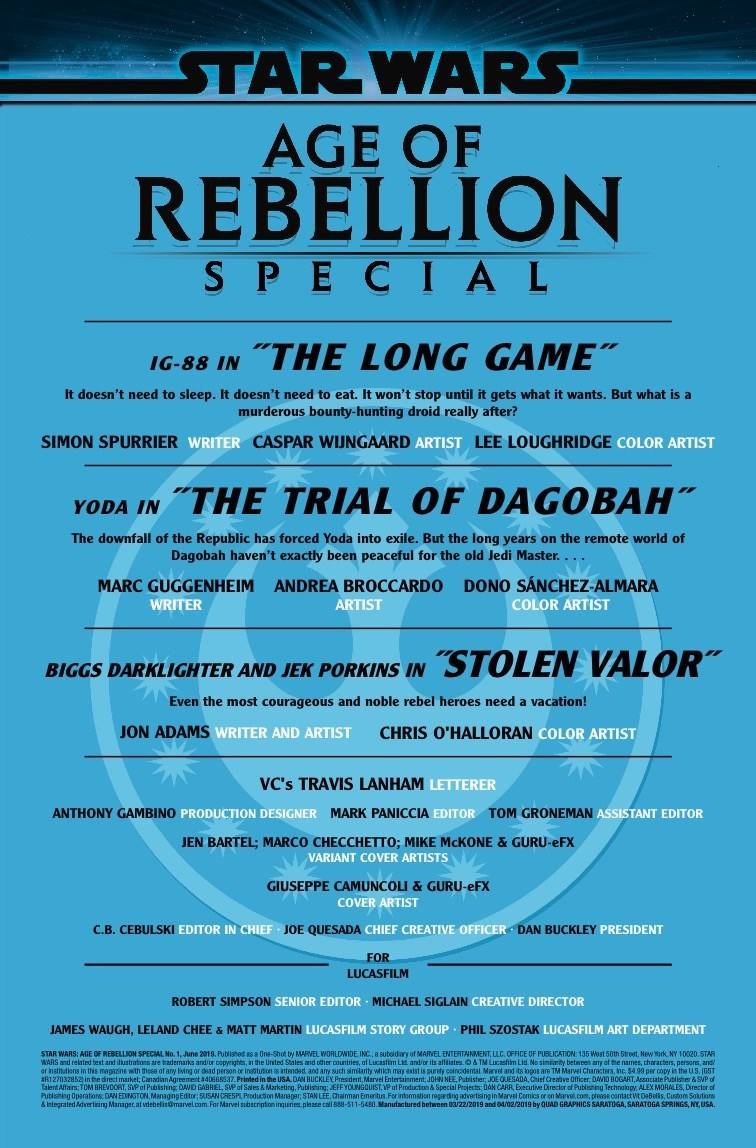 A ONE-SHOT SPECIAL FEATURING YOUR FAVORITE (AND UNEXPECTED) CHARACTERS FROM THE ORIGINAL STAR WARS TRILOGY! Move over, Boba Fett. The most dangerous bounty hunter in the galaxy isn’t who you think. The cold, calculating assassin droid IG-88 had a deadly reputation. Wanted criminals should tremble in fear because IG-88 will stop at nothing to get the job done. But where did it come from? What does it want? Perfection might be a good place to start. SI SPURRIER (DOCTOR APHRA) and CASPAR WIJNGAARD (DOCTOR APHRA ANNUAL) bring the terrifying droid to life! The destruction of the Order, the death of his friends, exile — no matter what he has endured, YODA will always be a Jedi. Even in hiding on the isolated planet of Dagobah, far from the evil Empire’s reach, a Jedi’s work is never done. Marc Guggenheim (X-MEN GOLD) and ANDREA BROCCARDO (STAR WARS) will pay the wise, old master a visit! The freedom-fighting REBEL ALLIANCE has more than its fair share of heroes — like ace pilots BIGGS DARKLIGHTER and JEK PORKINS. But they’ve been fighting the evil Galactic Empire for a long time and sometimes, even noble warriors like Biggs and Porkins need a little rest and relaxation. Is anywhere truly free from the trials of the galactic conflict? Writer and illustrator JON ADAMS (the New Yorker, LOVE ROMANCES) has the answer!