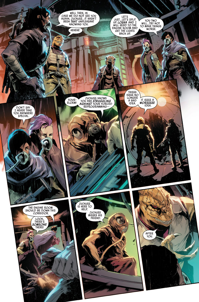 FORLORN FOR 4-LOM! T’ONGA and her bounty hunters are desperate to recover 4-LOM for their mission…but the upgraded killer droid is the one hunting them aboard a ghost ship. Can ZUCKUSS survive a reunion with his onetime partner? Meanwhile, VUKORAH makes her move…and the criminal underworld will never be the same!