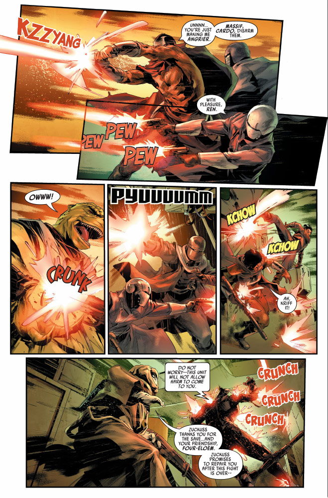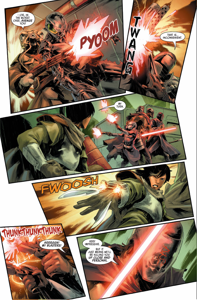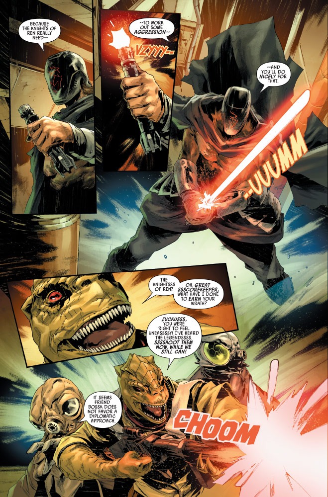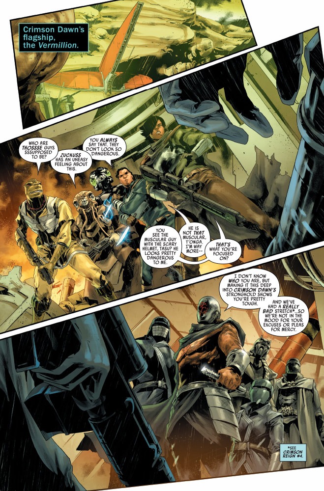 THE KNIGHTS OF REN! Dengar is leading T’onga’s bounty hunter crew on a desperate attempt to break into the Crimson Dawn’s stronghold – and he’s also leading them into a trap! Meanwhile, Valance has found new purpose as Darth Vader’s secret weapon. But how far will he be willing to go to protect an Imperial officer from assassins?