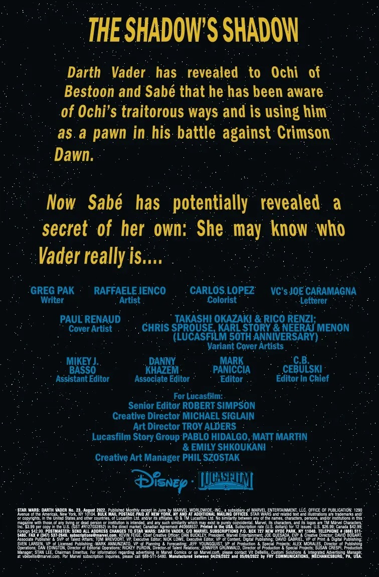 An epic new story begins as DARTH VADER embarks upon a new mission in partnership with a sworn enemy—but who’s leading whom to doom? And what happens when the QUEEN’S SHADOW learns the deepest secret of the Dark Lord of the Sith? Plus: the shocking return of a face from Vader’s most distant past!