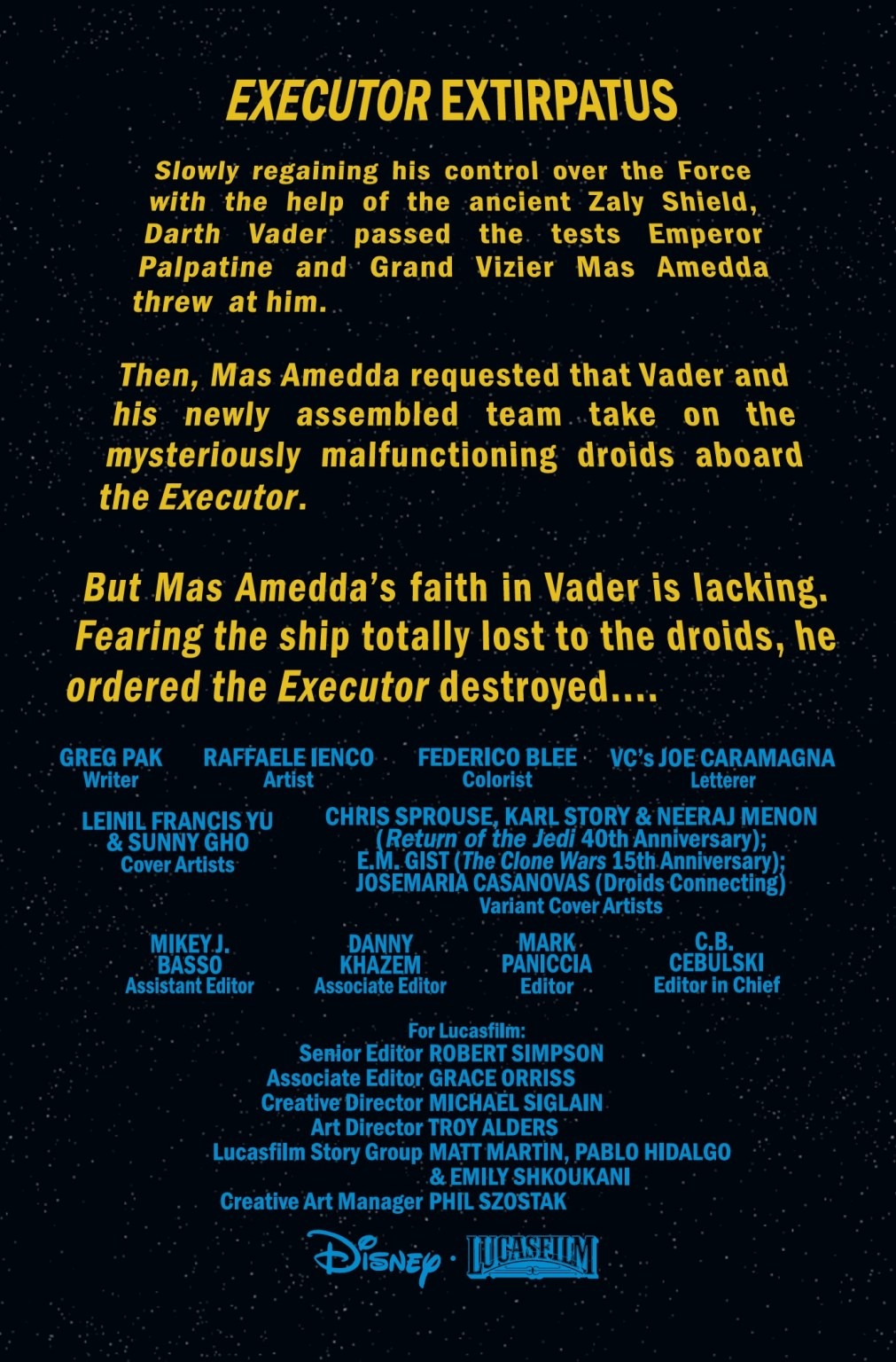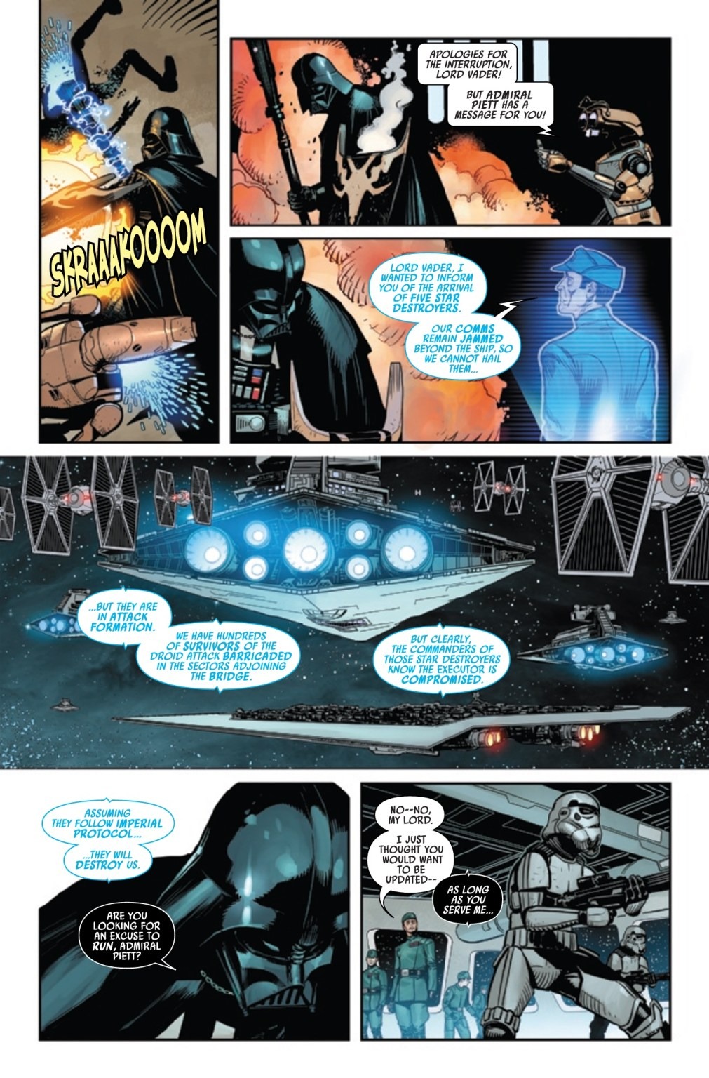 THE SCOURGE COMES FOR THE EXECUTOR! – A DARK DROIDS TIE-IN! As DARTH VADER’S Super Star Destroyer flagship faces its deadliest threat ever, the DARK LORD fights the war on two fronts — against a horde of SCOURGED DROIDS…and against the forces of THE EMPIRE itself! Featuring a rare glimpse into the true character of ADMIRAL PIETT!