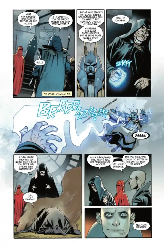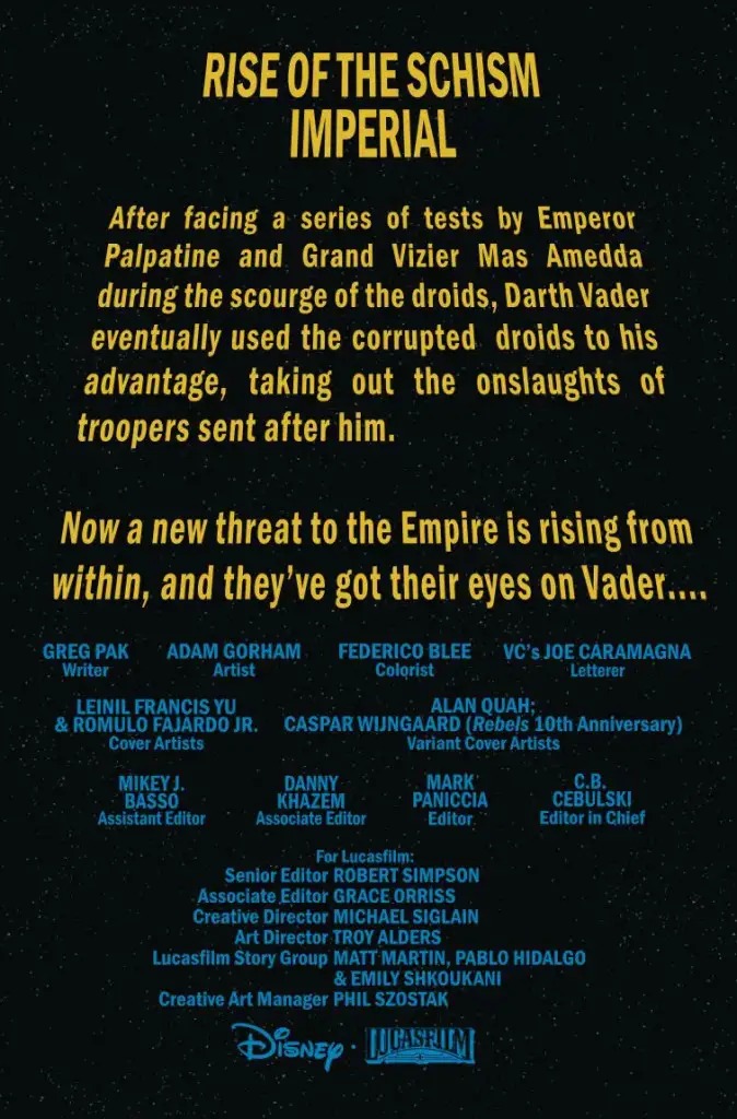 THE RISE OF THE SCHISM IMPERIAL! In the wake of DARK DROIDS, DARTH VADER explores his powers and takes on the most dangerous team of rebel heroes he’s ever faced! Meanwhile, the greatest threat to the EMPEROR’s rule is rising – from within THE EMPIRE itself! Will the DARK LORD OF THE SITH destroy it – or join it? Featuring the comic-book debut of ENRIC PRYDE from Star Wars: The Rise of Skywalker!