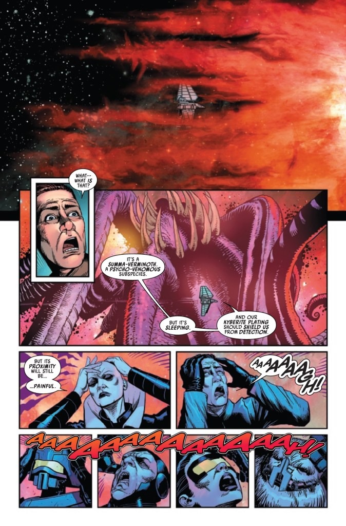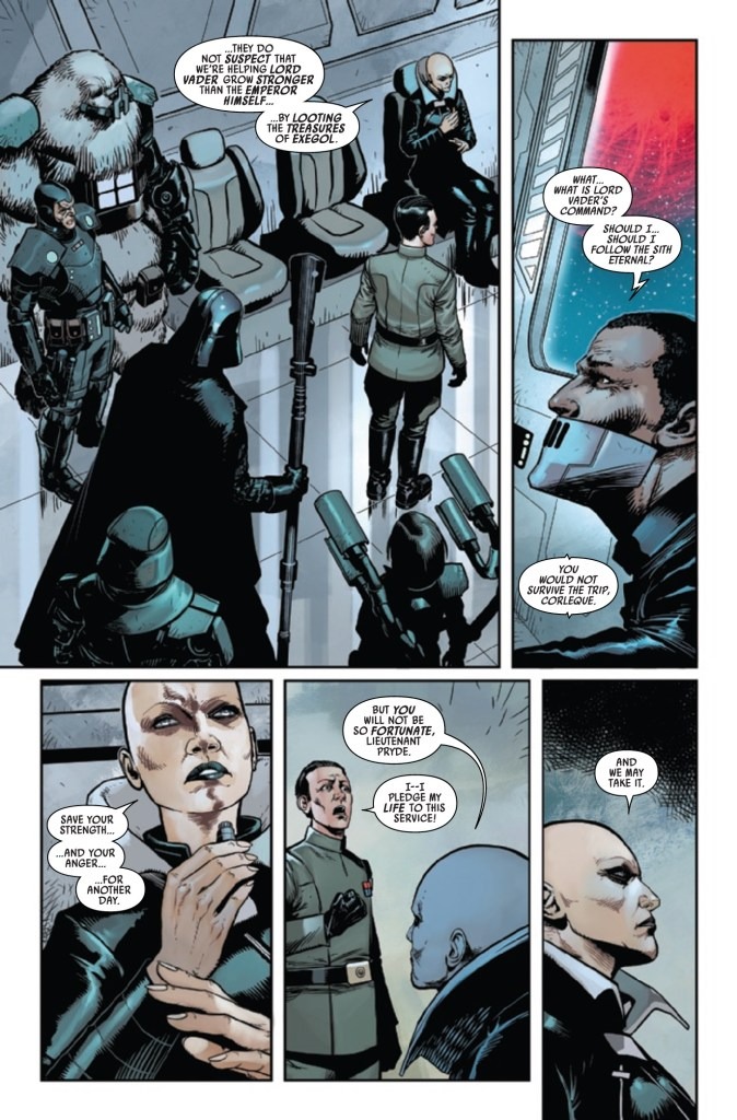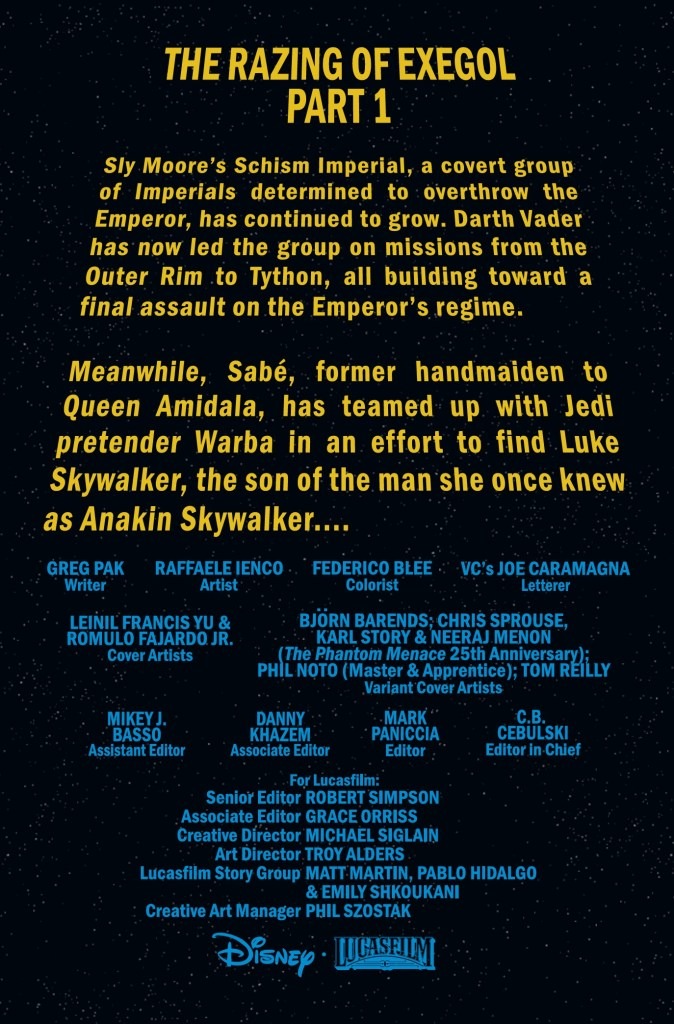 THE RAZING OF EXEGOL, PART ONE! DARTH VADER and the SCHISM IMPERIAL launch their boldest challenge to the power of PALPATINE with an assault on EXEGOL, the home of the EMPEROR’S greatest secrets and treasures! But if sheer brute force can’t overcome the defenses of the SITH CITADEL, what terrifying new resources will the DARK LORD draw upon? Also: CAPTAIN ENRIC PRYDE faces his greatest test!
