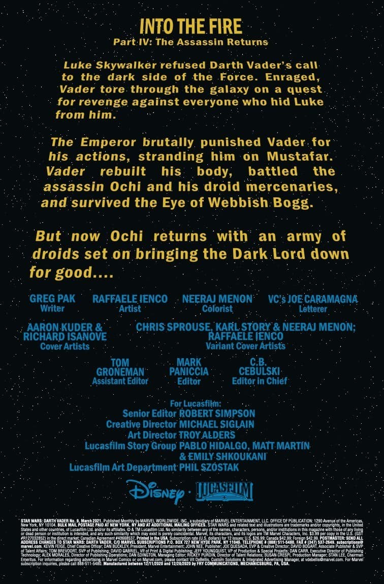 THE ASSASSIN RETURNS! In his search for vengeance in the depths of MUSTAFAR, DARTH VADER has seized the mysterious key to the EMPEROR’S greatest secret. But the key itself needs a key — which only the deadly assassin OCHI OF BESTOON seems to have. Vader and Ochi are in for the fight of their lives with the fate of the Emperor in the balance — but how much of this is all PALPATINE’S plan? And what happens when the SITH LORD and the SITH ASSASSIN start to figure that plan out?
