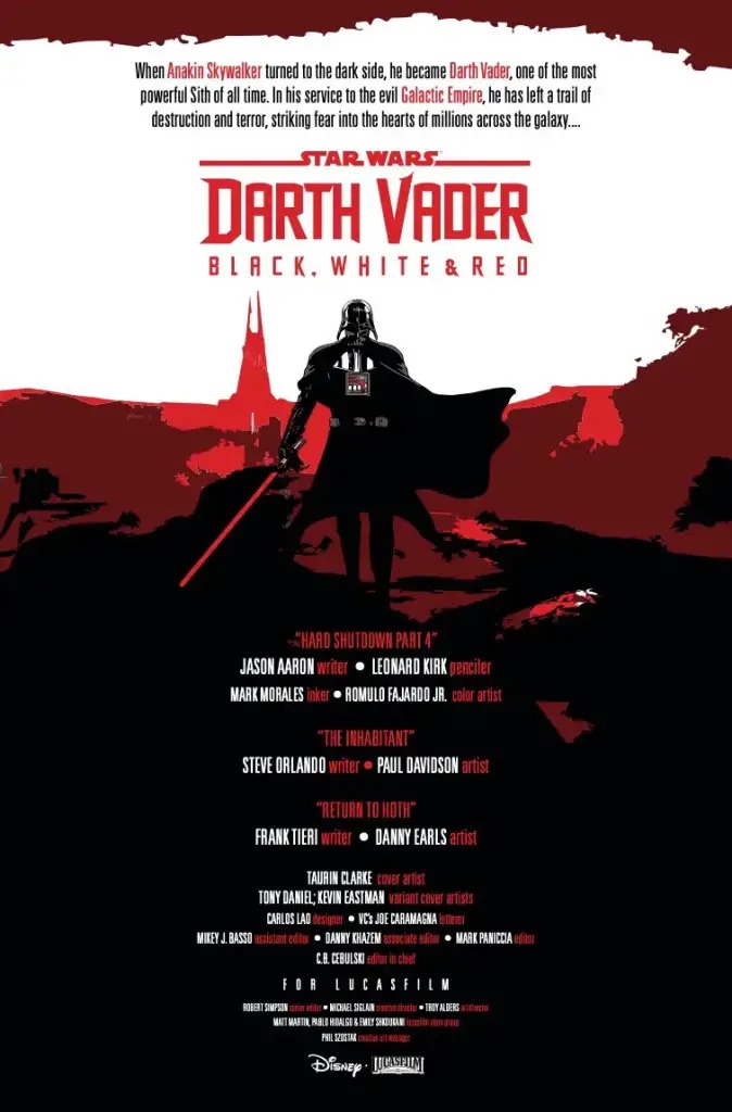TRAPPED ON THE FROZEN PLANET HOTH! Frank Tieri sends VADER to HOTH. Steve Orlando goes cerebral with THE CORRUPTION OF DARTH VADER’S MIND! PLUS: The Final Chapter of Jason Aaron & Leonard Kirk’s dark tales!