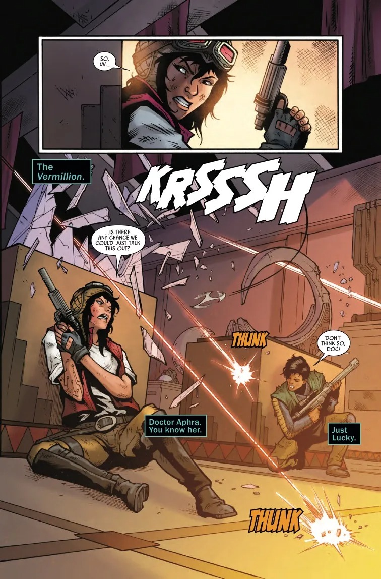 CRIMSON DAWN is back, and DOCTOR APHRA is trapped aboard their ship! What treasures lie aboard the VERMILLION? And what price will Aphra have to pay to obtain them?