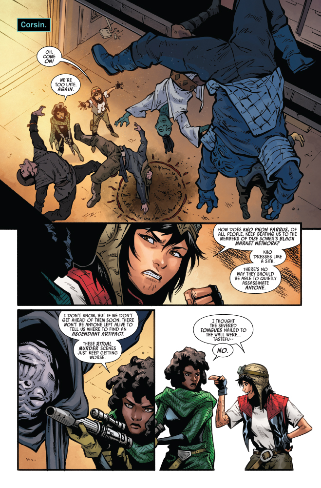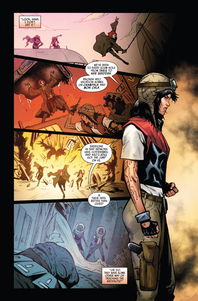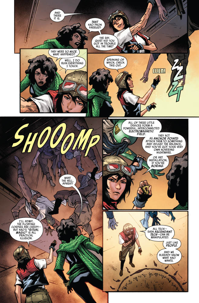“CONJURATIONS” With STRANGE RITUAL MURDERS on the rise, DOCTOR APHRA and SANA STARROS’ hunt for HOWLING ARTIFACTS is growing dire! Their leads keep turning up dead, and they’re running out of time! They’ll have to delve deep into the secrets of an ANCIENT TECH CULT if they plan to catch the killer!