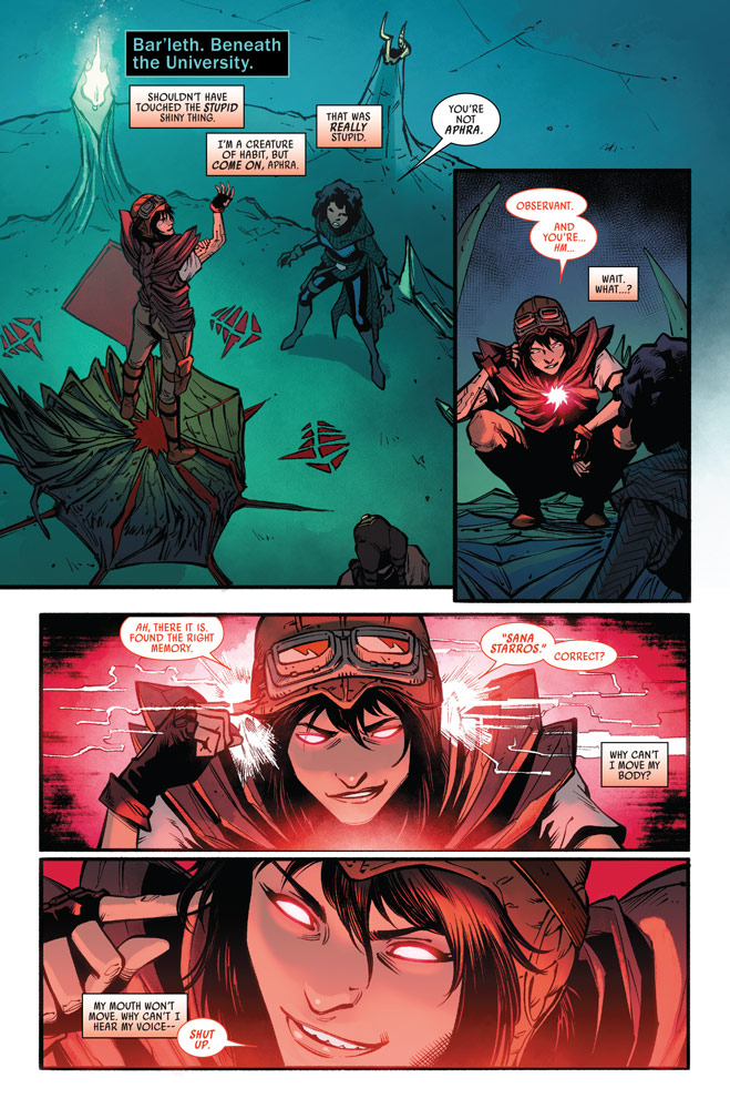 “DESPERATE MEASURES!” The SPARK ETERNAL corrupts everything it touches, and DOCTOR APHRA is no exception! Face-to-face with an ancient, malevolent presence, SANA STARROS will have to make a choice… Can she save Aphra? Can she even save herself?