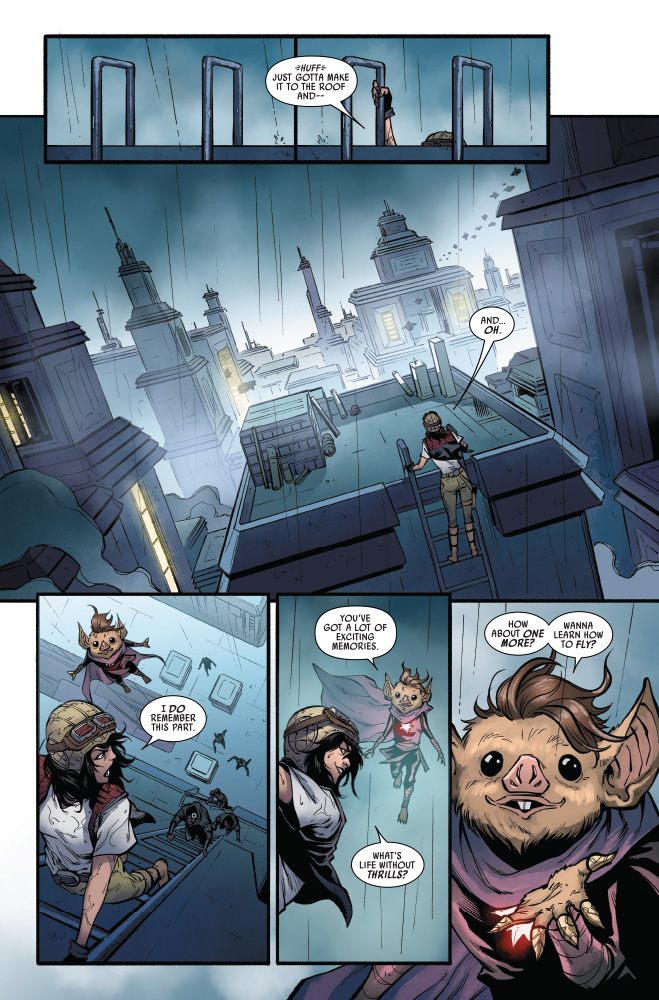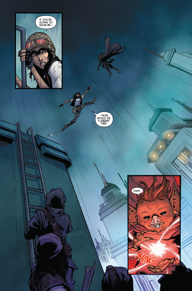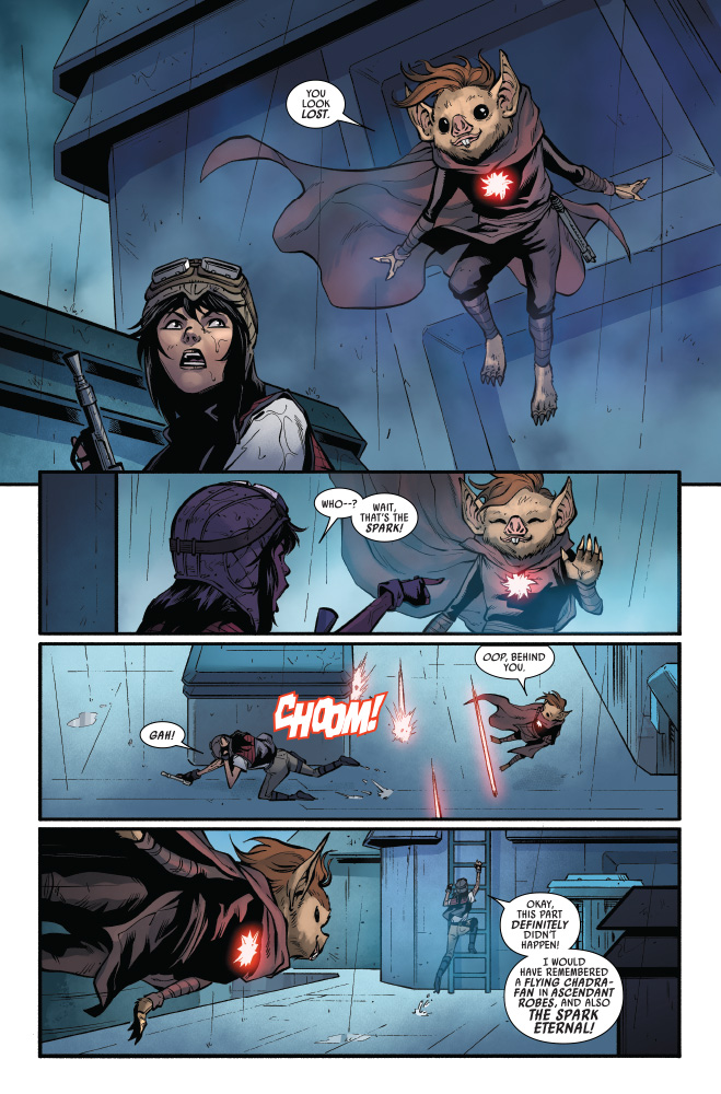“DESCENT” Desperate to rescue DOCTOR APHRA at any cost, SANA STARROS and her CREW’s search leads them to an OLD HAUNT…and two FAMILIAR FACES they might not survive! Meanwhile, Aphra delves deeper into the secrets of THE ASCENDANT…and the true origin of the SPARK ETERNAL!