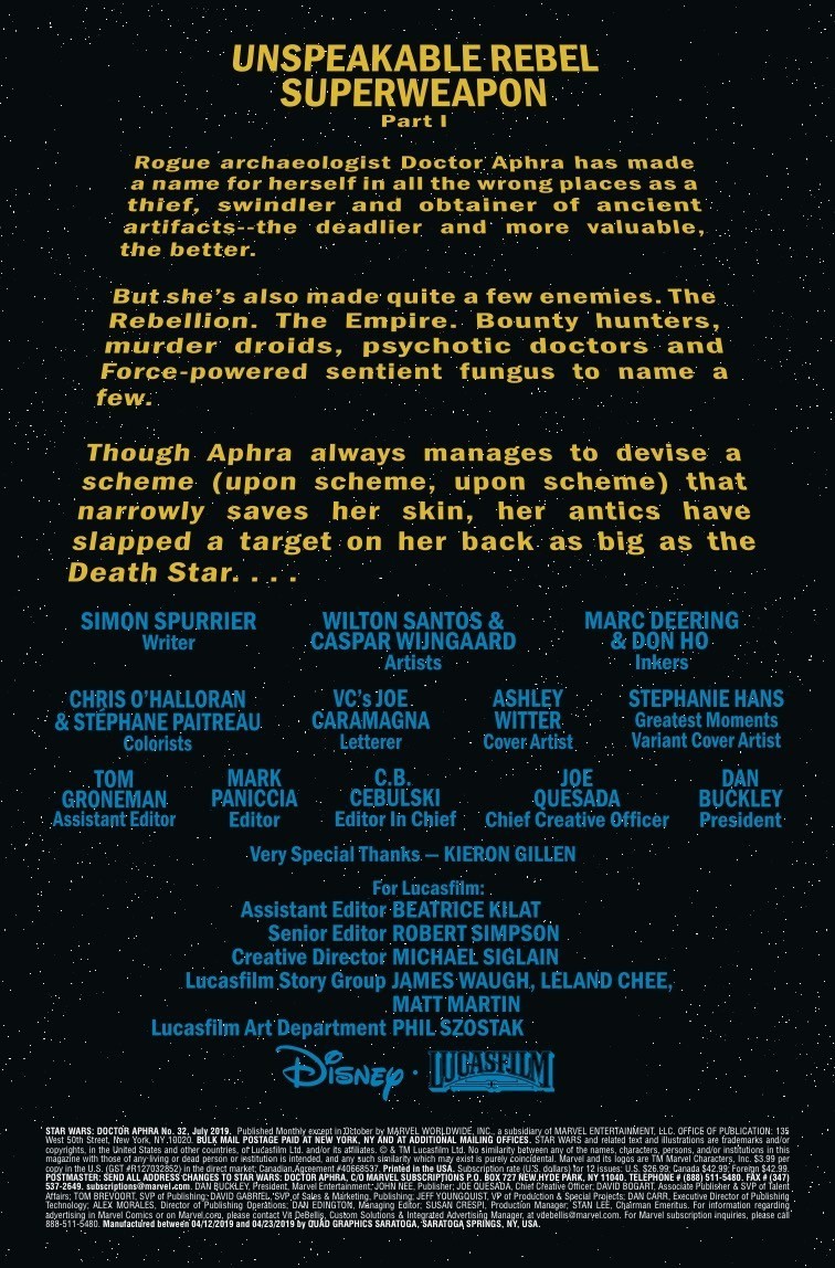 UNSPEAKABLE REBEL SUPERWEAPON: PART 1 A NEW ADVENTURE STARTS HERE! After a year of close shaves, Doctor CHELLI APHRA is taking it easy and lying low. Probably herding banthas or something. She’s smart like that, right? NAH, not really. The galaxy’s shadiest archaeologist is back doing what she does best: busting into alien temples to steal horrifying weapons for huge profit. She just can’t stop herself. But plenty of other people could. Powerful factions are watching closely: Rebel and Empire, familiar and strange – all calculating whether Aphra’s more useful alive… or dead.