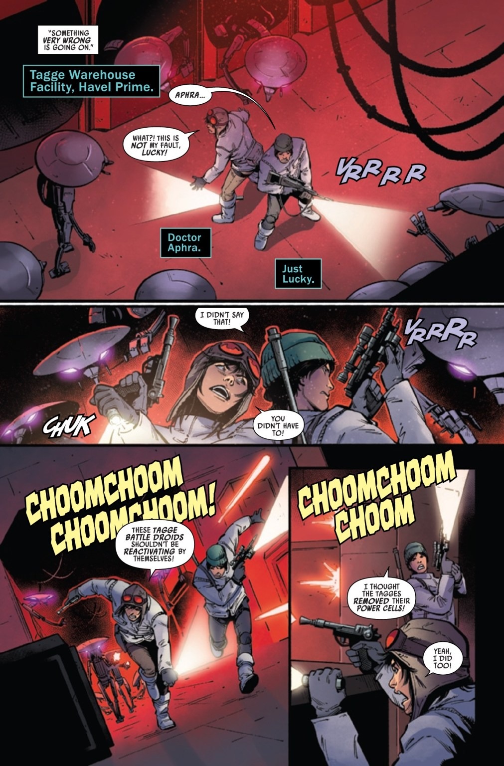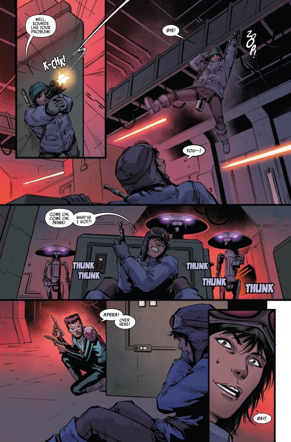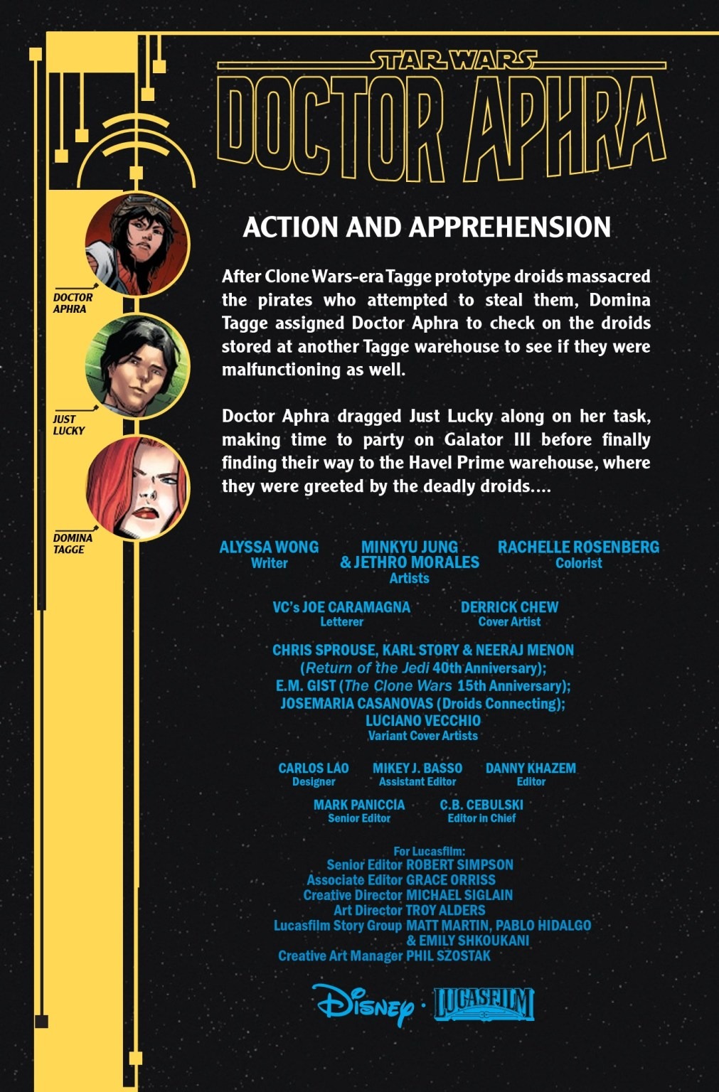 AMBUSHED! – A DARK DROIDS TIE-IN! Trapped in a warehouse full of DEADLY BATTLE DROIDS, DOCTOR APHRA fights for her life! But she’s about to come face-to-face with THE ONE ENEMY she never expected to see again!
