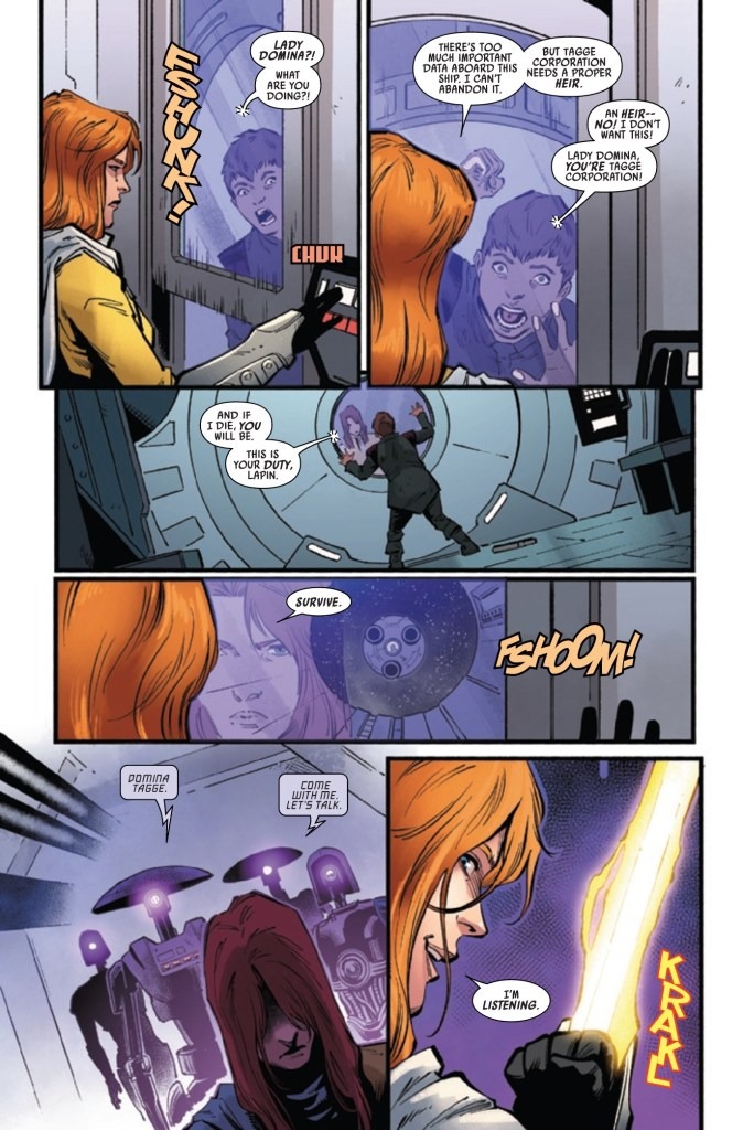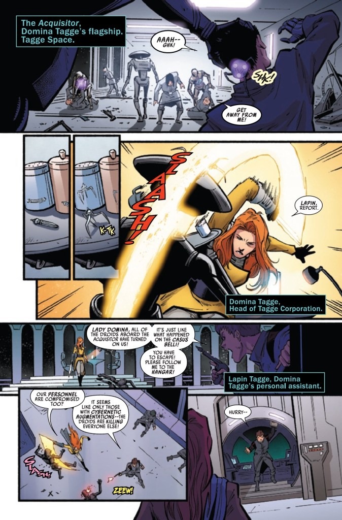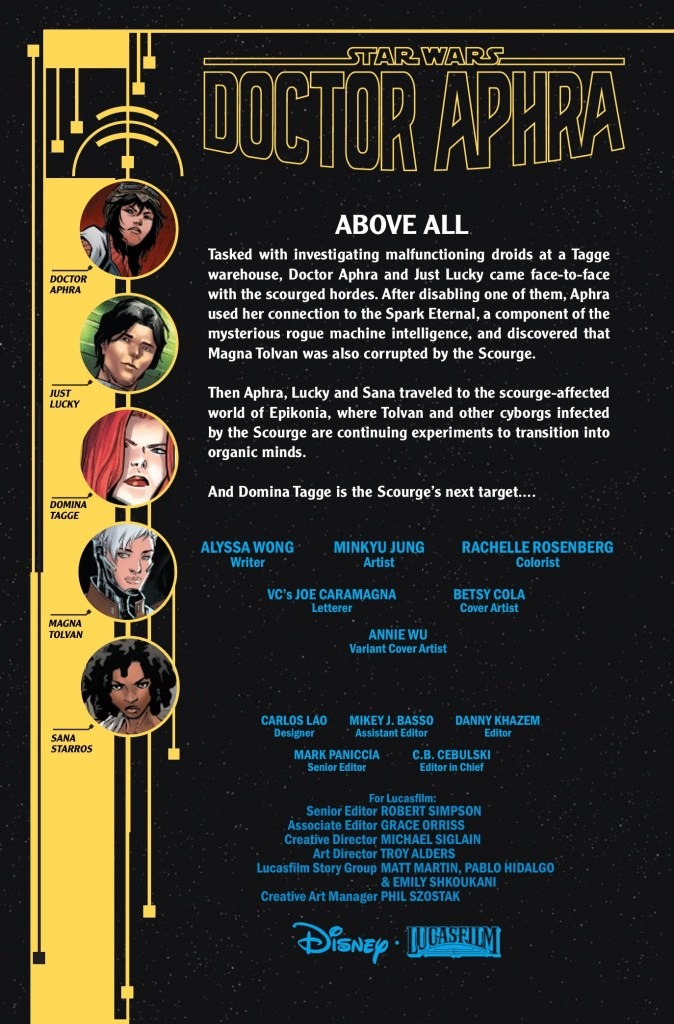 ABOVE ALL! – A DARK DROIDS TIE-IN! The SCOURGE sets its sights on TAGGE CORPORATION…and DOMINA TAGGE! As the ACQUISITOR falls from the sky, DOCTOR APHRA fights for survival…against an entity that threatens to consume everything she loves! (Including herself!)