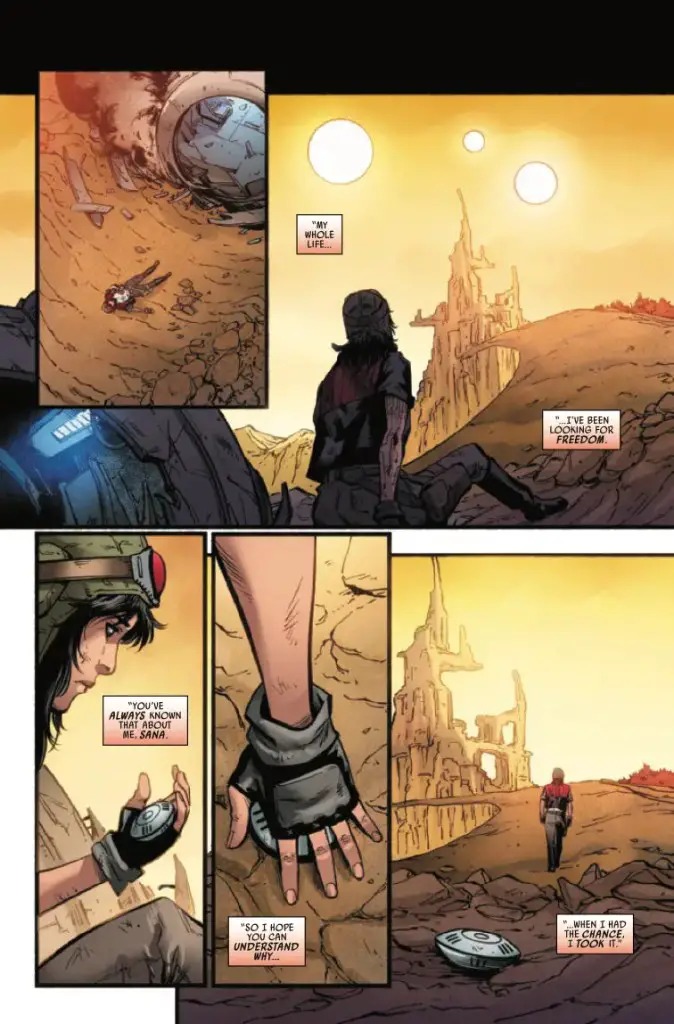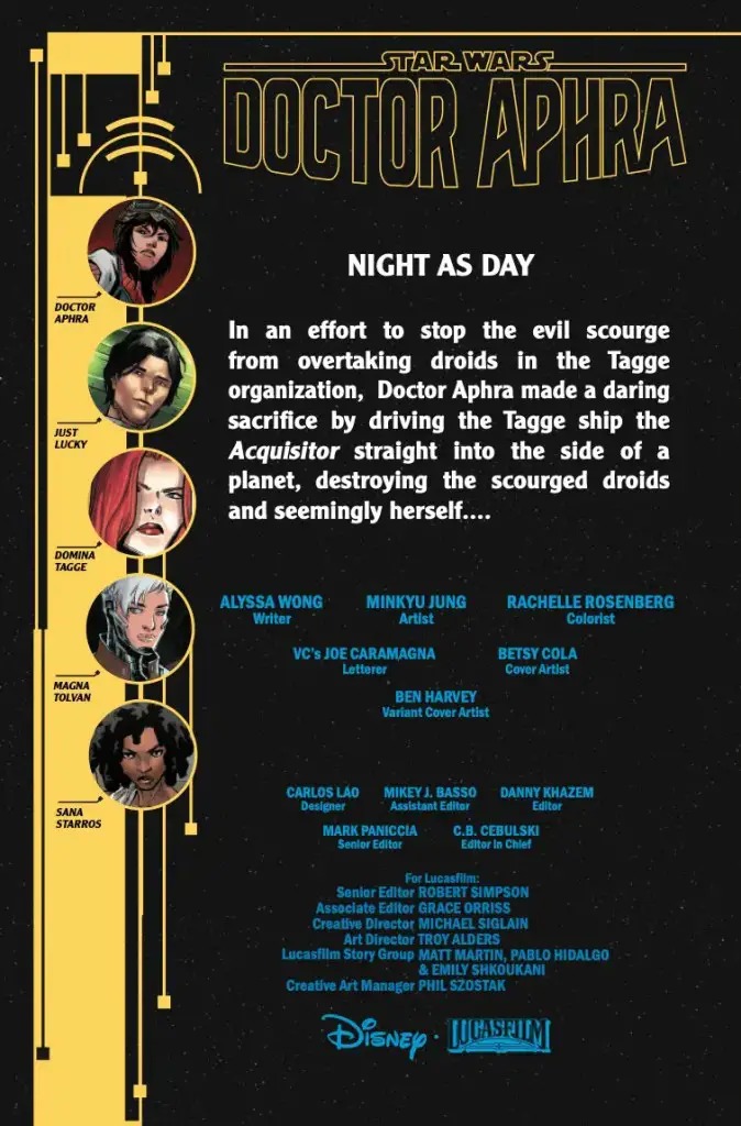 NIGHT AS DAY! The TAGGE FLEET burns. The GALAXY reels. DOCTOR APHRA is alone. But as she explores an ancient ruin on a desolate planet, Aphra may find the answers she’s been hunting for her entire life. Is this the end for DOCTOR APHRA?!