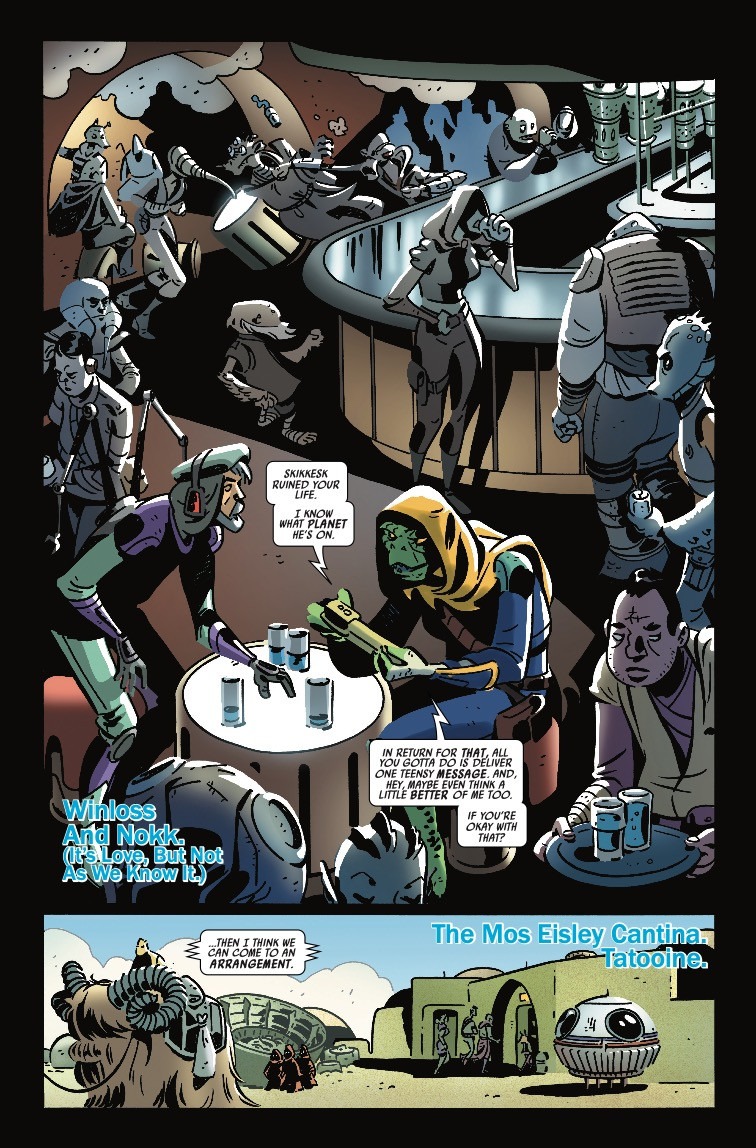 THE ARRANGEMENT – A DONE-IN-ONE TALE! MOS EISLEY: you will never find a more wretched hive of scum and villainy — and even from far away DOCTOR APHRA wears this place like a glove…Caught in her wake, struggling beast-hunters WINLOSS AND NOKK are about to cross paths with their most monstrous adversary yet…Oh blast, is that BLACK KRRSANTAN? And is there really an audience with JABBA THE HUTT up for grabs?