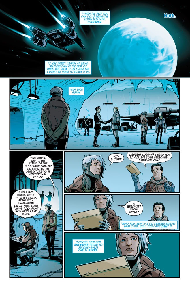 DESTINED FOR HOTH! Luke Skywalker, Princess Leia Organa and smuggler Han Solo have have struck blow after winning blow against the Empire. The Rebels are digging in their defenses on the remote ice world of Hoth but how long will they truly be safe from their many enemies? Darth Vader will stop at nothing to crush the rebels but his efforts to locate their new base have been in vain. Will the dark side of the Force guide him to the missing rebels and to young Skywalker or mire the dark lord in the conflicts of his past? Despite a life riddled with treachery and destruction, Doctor Aphra has found a family (of sorts). Former Imperial inspector Magna Tolvan and Aphra’s young ward Vulaada will have to face the struggles of a life of rebellion…while Aphra reckons with her legacy. Former Imperial loyalist turned cyborg bounty hunter BEILERT VALANCE is taking on a dangerous new mission. And the lives of the entire Rebellion—including his old buddy HAN SOLO’s—are at stake should he fail!