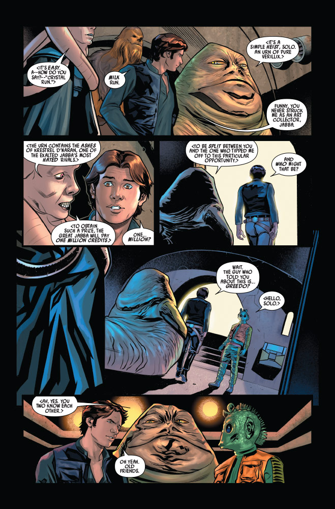 NEW ONGOING SERIES – HAN SOLO IS BACK! But wait! Isn’t HAN still frozen in Carbonite? Yes. But you can’t keep a good smuggler down. Set a few years before Episode IV: A New Hope, Han, his partner, CHEWBACCA and GREEDO, embark on a heist for JABBA THE HUTT. It’s supposed to be an easy job. What could possibly go wrong? Well, for starters, how about a reunion with the very last person Han expected to see? The last page is a jaw-dropper…
