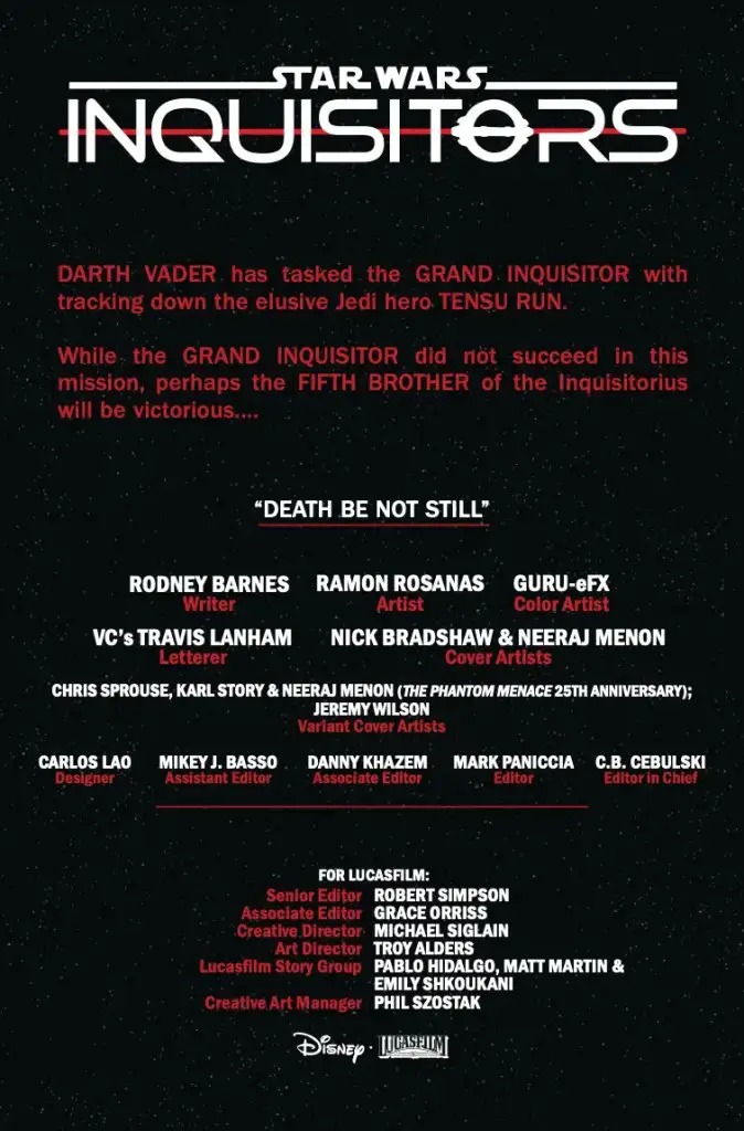 DARTH VADER SENDS FIFTH BROTHER ON A MISSION TO KILL A JEDI LEGEND! The EMPEROR has had most of the JEDI exterminated after the events of ORDER 66! Some have escaped! THE INQUISITORS are charged with hunting the survivors down. But there is one, a knight named TENSU RUN, who is on DARTH VADER’S most-wanted list! Who is Tensu Run, and what threat does he pose to the DARK LORD?