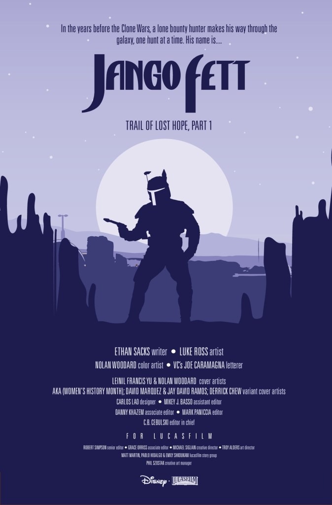JANGO FETT EMBARKS ON A BRAND-NEW MISSION! AS SEEN IN STAR WARS: REVELATIONS! ETHAN SACKS (STAR WARS: BOUNTY HUNTERS) & LUKE ROSS (STAR WARS: WAR OF THE BOUNTY HUNTERS, STAR WARS: DARK DROIDS) team up to continue the legacy of one of the greatest bounty hunters: JANGO FETT! A bounty to find! A mystery to solve! A treaty at risk! All this with AURRA SING in the mix!!!
