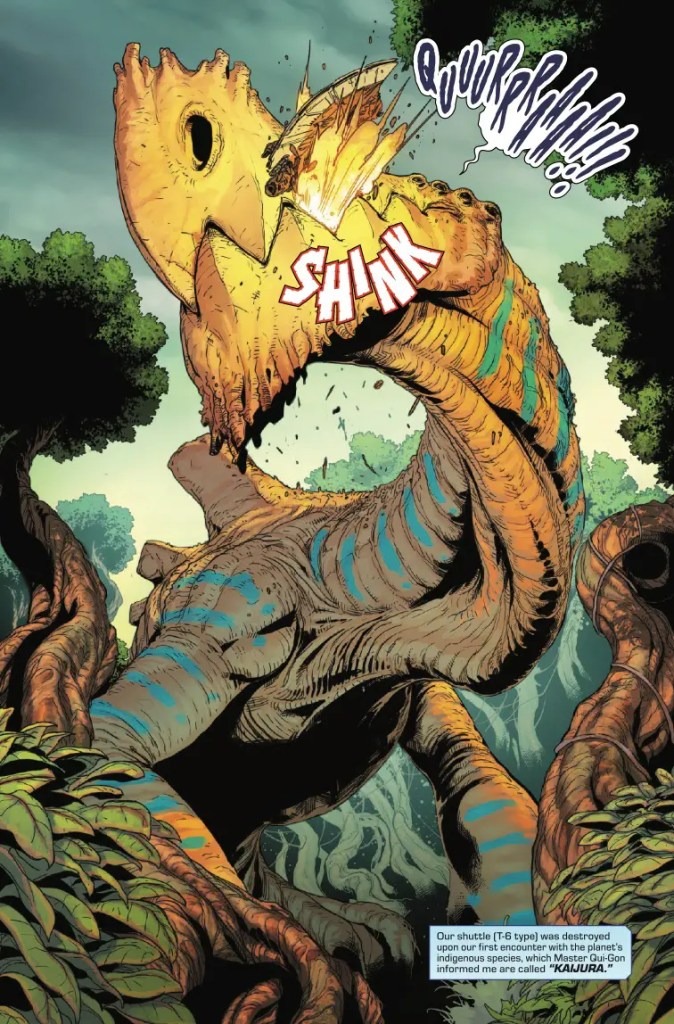 QUI-GON JINN AND OBI-WAN KENOBI BATTLE GIANT MONSTERS! ALL SPLASH PAGES! ALL ACTION! The most unusual Jedi Knights tale ever told! QUI-GON and OBI-WAN defy death in an epic attempt to save the life of SENATOR BAIL ORGANA on a planet full of skyscraper-sized monsters!