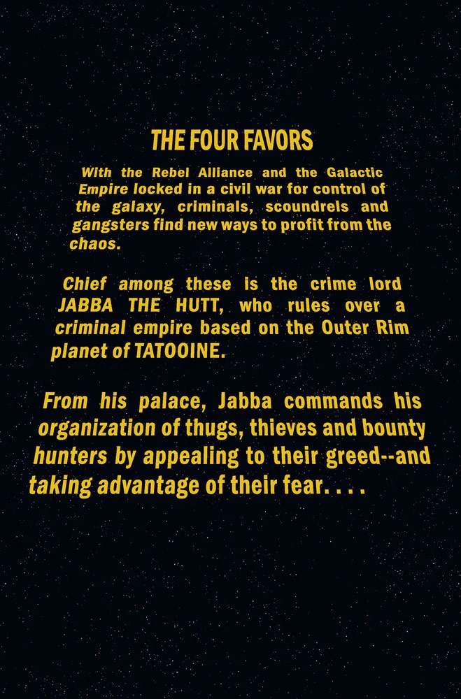 WHO IS PLOTTING TO OVERTHROW JABBA THE HUTT? Jabba’s palace is one of many places to find the vilest of scum and villainy relaxing, wet their whistles and indulge their vices…who would ever want that to end? Well, SOMEONE has Jabba in their sights! Beginning a series of One-Shots spotlighting the RETURN OF THE JEDI era, Marc Guggenheim (HAN SOLO & CHEWBACCA) and Alessandro Miracolo (OBI-WAN) bring you a tale of Jabba’s Palace you won’t soon forget!