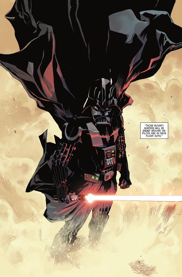 DARTH VADER is trapped, alone, and surrounded by deadly bounty hunters… …but the SITH LORD is never truly alone as long as he wields the Dark Side of The Force! VALANCE and his gang of bounty hunters soon find that the hunters have become the hunted, as Vader picks them off one-by-one — and he’s helped by one of Valance’s own!