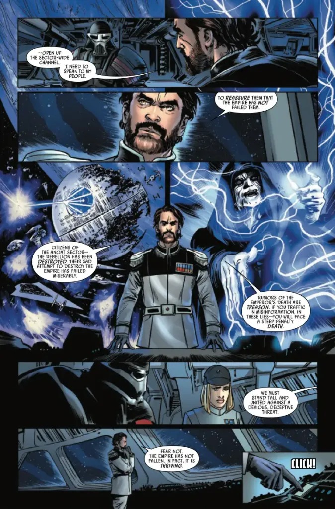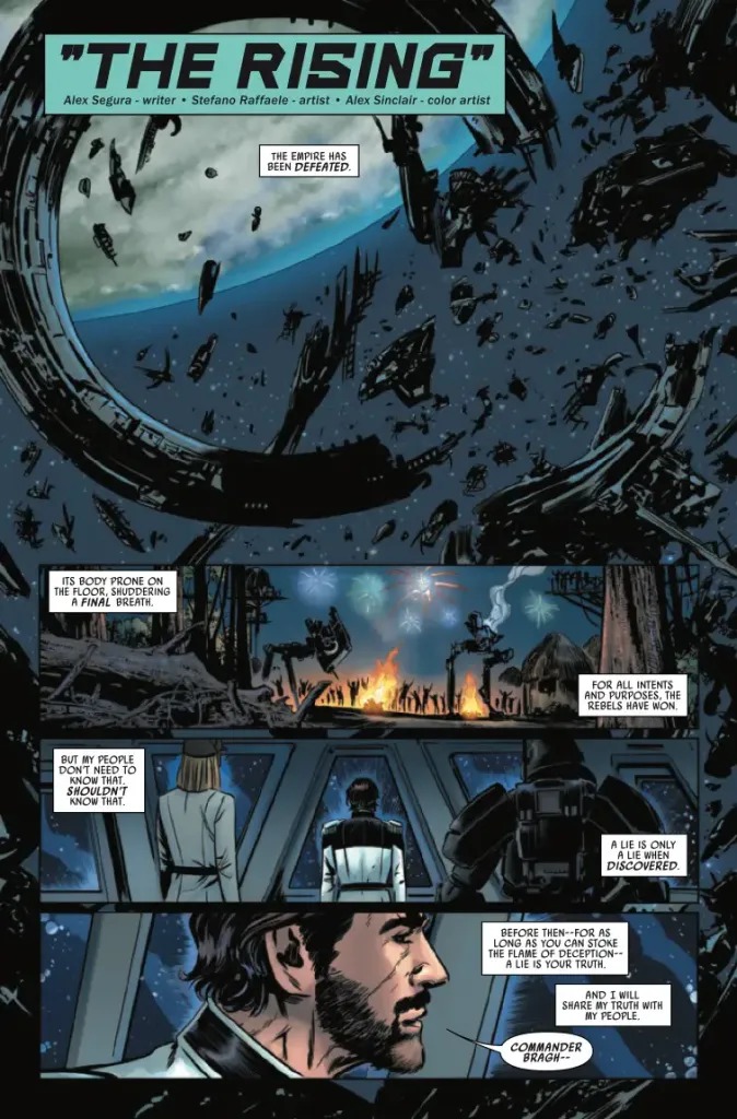 IN THE WAKE OF THE BATTLE OF ENDOR, CAN LUKE, LEIA AND THE NASCENT NEW REPUBLIC STAVE OFF AN UNEXPECTED — AND DEADLY — NEW THREAT? A DEFIANT IMPERIAL takes center stage — and goes on the offensive against the NEW REPUBLIC! LEIA makes a startling discovery in the forests of ENDOR! Who are the mysterious and deadly ACOLYTES OF THE BEYOND?! What is the new villain’s connection to DARTH VADER? All this as the post-Return of the Jedi storytelling BEGINS!