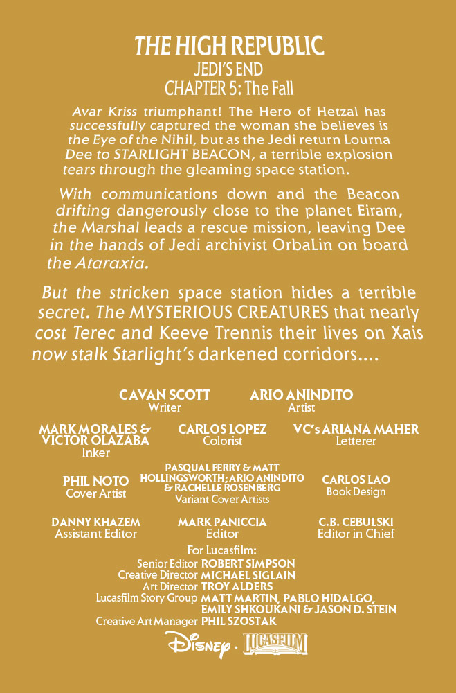 EVERYTHING CHANGES! Phase one of Star Wars: The High Republic reaches its galaxy-shaking conclusion. Only one person can save the Jedi from the mysterious monsters that stalk Starlight Beacon. Who will live and who will die?