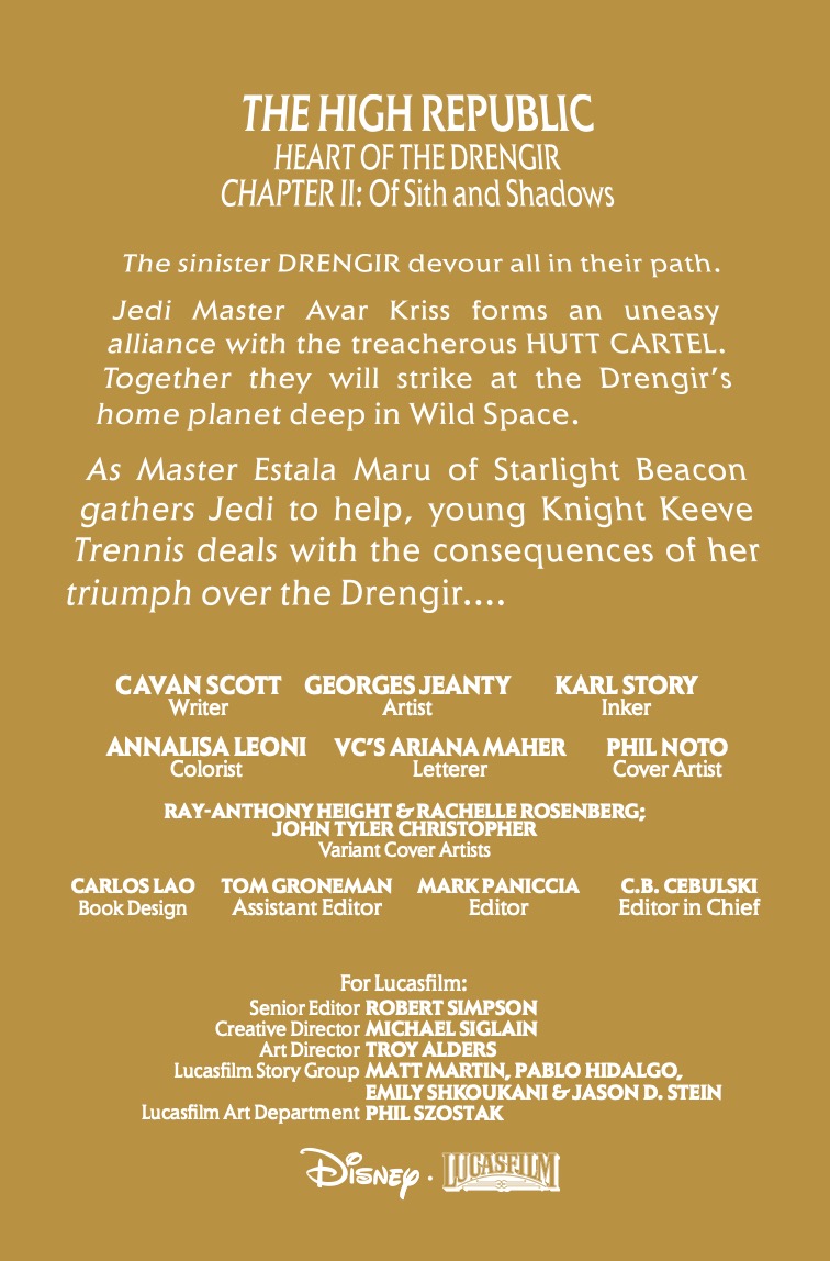 A JEDI FACES THE DARKNESS! KEEVE TRENNIS has put everything on the line to save her former master, but the scars run deep. As AVAR KRISS summons a task force to deal with the DRENGIR THREAT, a desperate NIHIL REMNANT attacks a distant outpost. Can Keeve fight back the shadows long enough to stand for light and life? Guest-starring ORLA JARENI, Jedi Wayseeker.