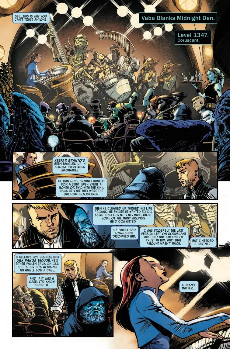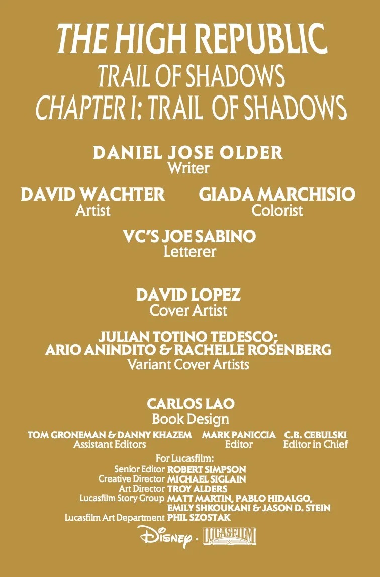 JEDI KNIGHT AND PRIVATE EYE TEAM UP TO UNCOVER A MYSTERY THAT WILL CHANGE THE HIGH REPUBLIC FOREVER! A Jedi Master is dead. Another is in a state of complete shock. It’s a murder the likes of which the Jedi Order has never seen before. There are no leads. There are no suspects. There is no motive. But Jedi Investigator EMERICK CAPHTOR must solve the case before it’s too late. The fate of the Jedi, the Hutts, the Nihil and everyone in the galaxy, hangs by this tangled thread of lies and deceit. Emerick will need to dive into the darkness, testing himself and his Jedi ideals like never before. He’ll need help. Luckily, Private Eye SIAN HOLT lives in the dark. Together, they’ll follow this trail of shadows wherever it leads. If they can work together, that is.